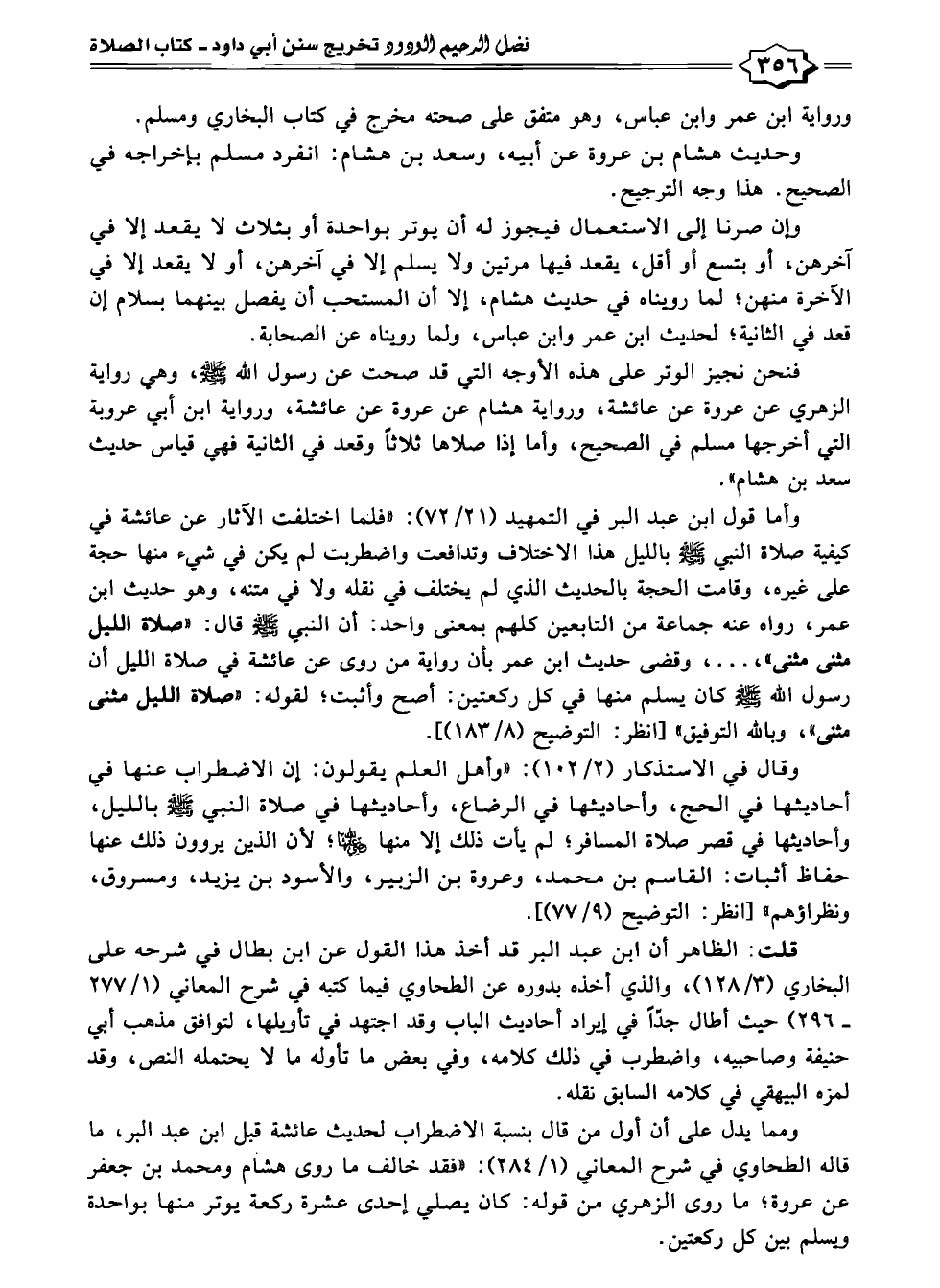 وأما قول ابن عبد البر في التمهيد (٢١/ ٧٢): "فلما اختلفت الآثار عن عائشة في كيفية صلاة النبي -صلى الله عليه وسلم- بالليل هذا الاختلاف وتدافعت واضطربت لم يكن في شيء منها حجة على غيره، وقامت الحجة بالحديث الذي لم يختلف في نقله ولا في متنه، وهو حديث ابن عمر، رواه عنه جماعة من التابعين كلهم بمعنى واحد: أن النبي -صلى الله عليه وسلم- قال: "صلاة الليل مثنى مثنى"، ... ، وقضى حديث ابن عمر بأن رواية من روى عن عائشة في صلاة الليل أن رسول الله -صلى الله عليه وسلم- كان يسلم منها في كل ركعتين: أصح وأثبت؛ لقوله: "صلاة الليل مثنى مثنى"، وبالله التوفيق" [انظر: التوضيح (٨/ ١٨٣)].