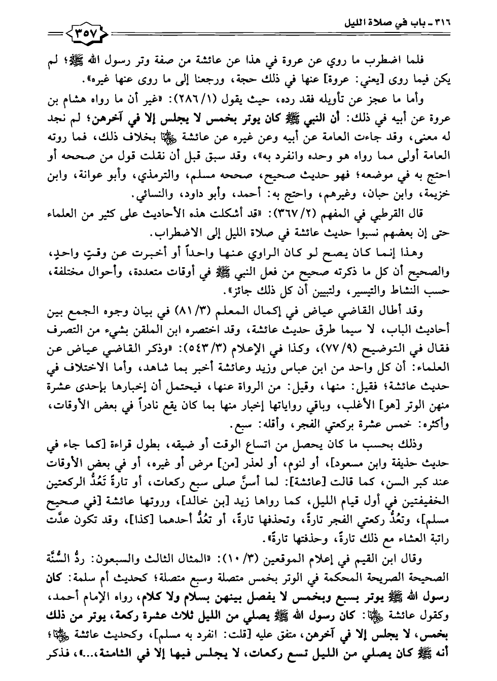 وقال ابن القيم في إعلام الموقعين (٣/ ١٠): "المثال الثالث والسبعون: ردُّ السُّنَّة الصحيحة الصريحة المحكمة في الوتر بخمس متصلة وسبع متصلة؛ كحديث أم سلمة: كان رسول الله -صلى الله عليه وسلم- يوتر بسبع وبخمس لا يفصل بينهن بسلام ولا كلام، رواه الإمام أحمد، وكقول عائشة -رضي الله عنها-: كان رسول الله -صلى الله عليه وسلم- يصلي من الليل ثلاث عشرة ركعة، يوتر من ذلك بخمس، لا يجلس إلا في آخرهن، متفق عليه [قلت: انفرد به مسلم]، وكحديث عائشة -رضي الله عنها-؛ أنه -صلى الله عليه وسلم- كان يصلي من الليل تسع ركعات، لا يجلس فيها إلا في الثامنة، ... "، فذكر