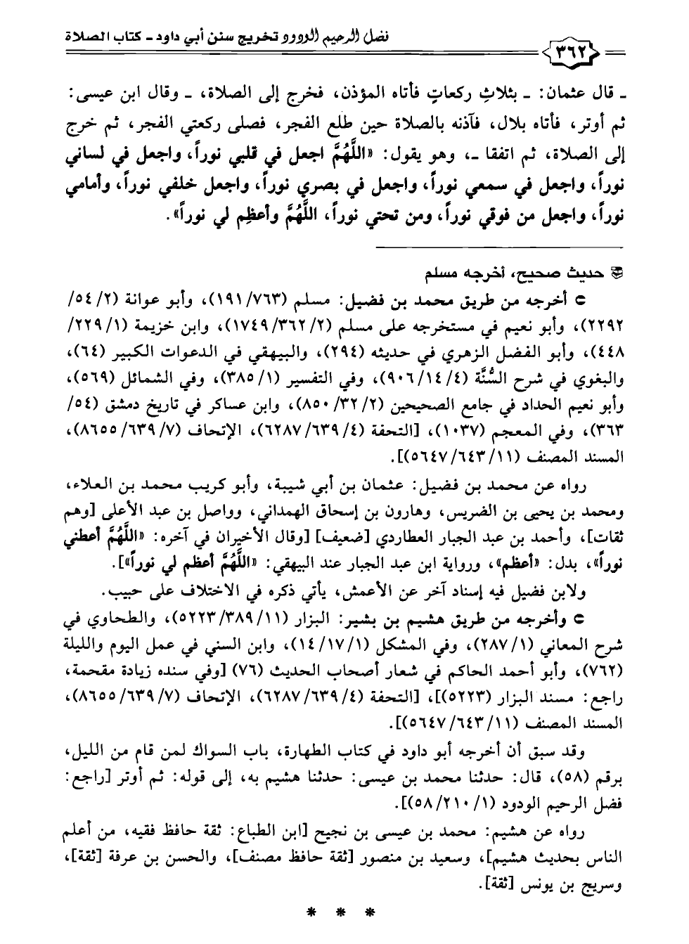 رواه عن محمد بن فضيل: عثمان بن أبي شيبة، وأبو كريب محمد بن العلاء، ومحمد بن يحيى بن الضريس، وهارون بن إسحاق الهمداني، وواصل بن عبد الأعلى [وهم ثقات]، وأحمد بن عبد الجبار العطاردي [ضعيف] [وقال الأخيران في آخره: "اللَّهُمَّ أعطني نورًا"، بدل: "أعظم"، ورواية ابن عبد الجبار عند البيهقي:، اللَّهُمَّ أعظم لي نورًا"].