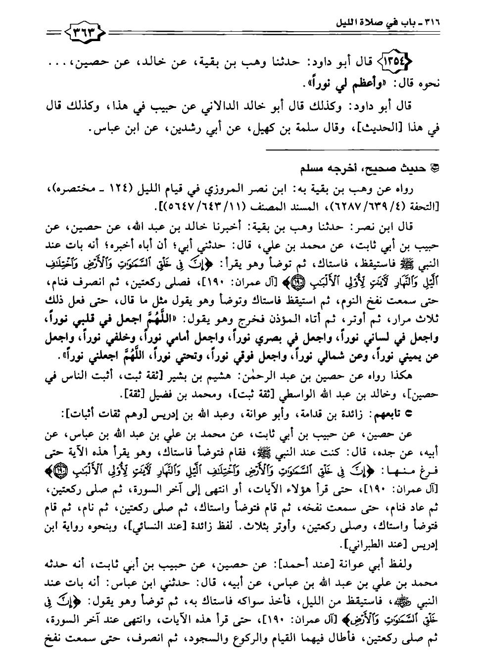 قال ابن نصر: حدثنا وهب بن بقية: أخبرنا خالد بن عبد الله، عن حصين، عن حبيب بن أبي ثابت، عن محمد بن علي، قال: حدثني أبي؛ أن أباه أخبره؛ أنه بات عند النبي -صلى الله عليه وسلم- فاستيقظ، فاستاك، ثم توضأ وهو يقرأ: {إِنَّ فِي خَلْقِ السَّمَاوَاتِ وَالْأَرْضِ وَاخْتِلَافِ اللَّيْلِ وَالنَّهَارِ لَآيَاتٍ لِأُولِي الْأَلْبَابِ (١٩٠)} [آل عمران: ١٩٠]، فصلى ركعتين، ثم انصرف فنام، حتى سمعت نفخ النوم، ثم استيقظ فاستاك وتوضأ وهو يقول مثل ما قال، حتى فعل ذلك ثلاث مرار، ثم أوتر، ثم أتاه المؤذن فخرج وهو يقول: "اللَّهُمَّ اجعل في قلبي نورًا، واجعل في لساني نورًا، واجعل في بصري نورًا، واجعل أمامي نورًا، وخلفي نورًا، واجعل عن يميني نورًا، وعن شمالي نورًا، واجعل فوقي نورًا، وتحتي نورًا، اللَّهُمَّ اجعلني نورًا".