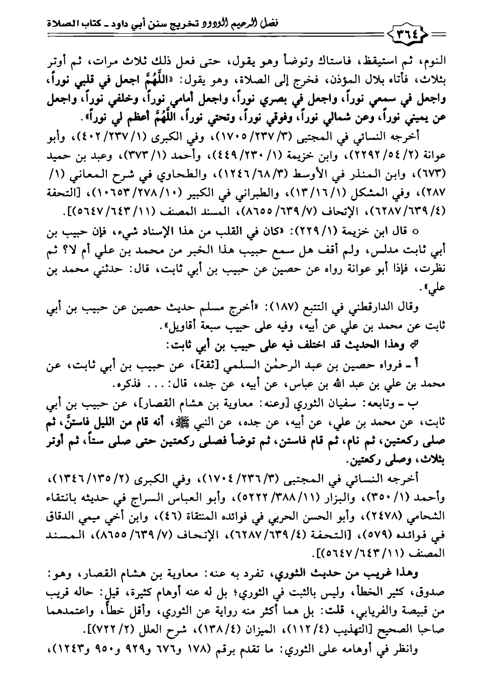 ب- وتابعه: سفيان الثوري [وعنه: معاوية بن هشام القصار]، عن حبيب بن أبي ثابت، عن محمد بن علي، عن أبيه، عن جده، عن النبي -صلى الله عليه وسلم-، أنه قام من الليل فاستنَّ، ثم صلى ركعتين، ثم نام، ثم تام فاستن، ثم توضأ فصلى ركعتين حتى صلى ستًا، ثم أوتر بثلاث، وصلى ركعتين.