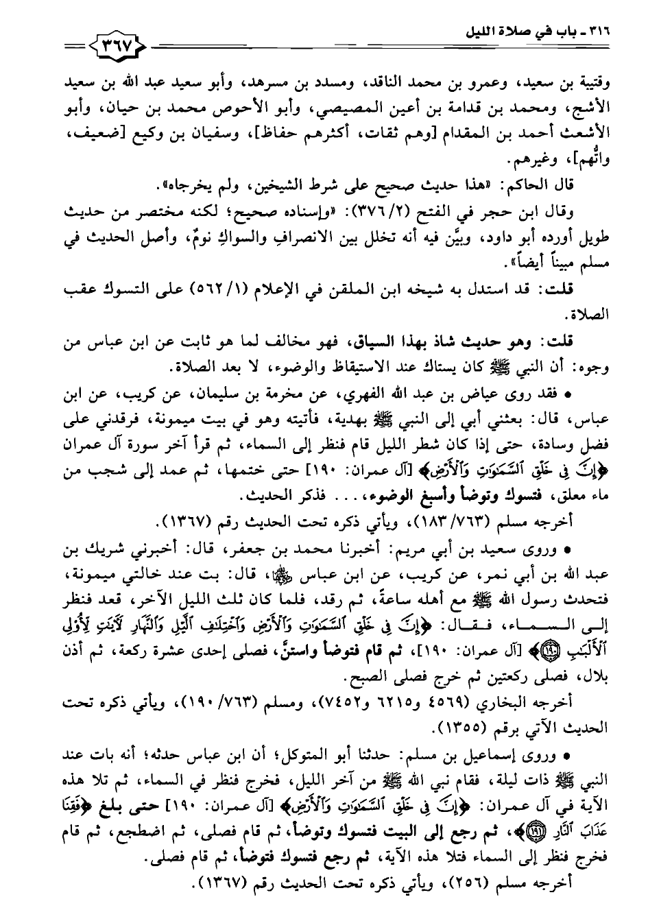 * وروى سعيد بن أبي مريم: أخبرنا محمد بن جعفر، قال: أخبرني شريك بن عبد الله بن أبي نمر، عن كريب، عن ابن عباس -رضي الله عنهما-، قال: بت عند خالتي ميمونة، فتحدث رسول الله -صلى الله عليه وسلم- مع أهله ساعةً، ثم رقد، فلما كان ثلث الليل الآخر، قعد فنظر إلى السماء، فقال: {إِنَّ فِي خَلْقِ السَّمَاوَاتِ وَالْأَرْضِ وَاخْتِلَافِ اللَّيْلِ وَالنَّهَارِ لَآيَاتٍ لِأُولِي الْأَلْبَابِ (١٩٠)} [آل عمران: ١٩٠]، ثم قام فتوضأ واستن، فصلى إحدى عشرة ركعة، ثم أذن بلال، فصلى ركعتين ثم خرج فصلى الصبح.