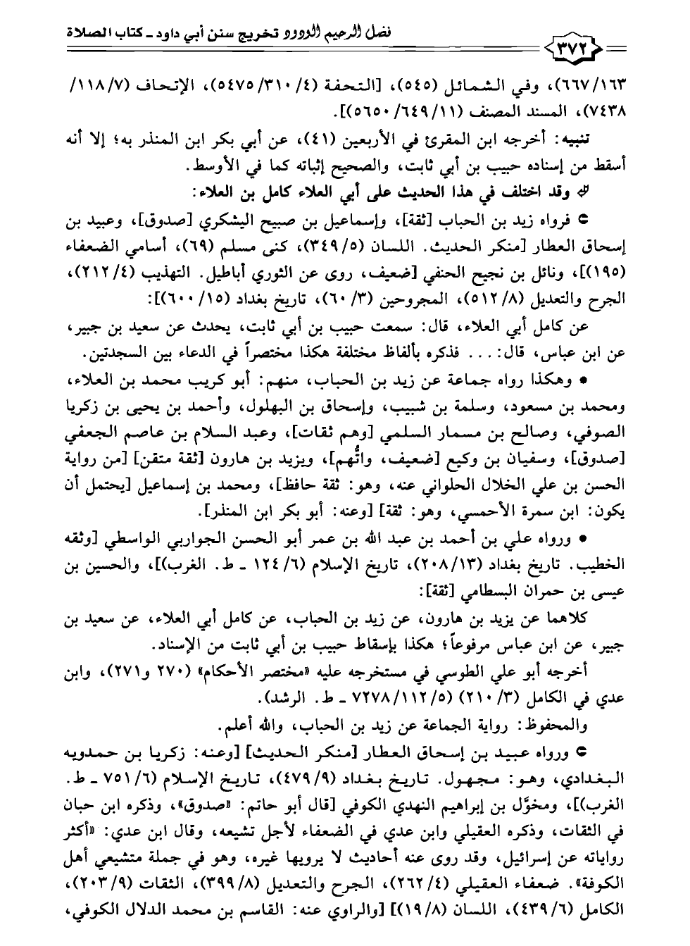 عن كامل أبي العلاء، قال: سمعت حبيب بن أبي ثابت، يحدث عن سعيد بن جبير، عن ابن عباس، قال: ... فذكره بألفاظ مختلفة هكذا مختصرًا في الدعاء بين السجدتين.