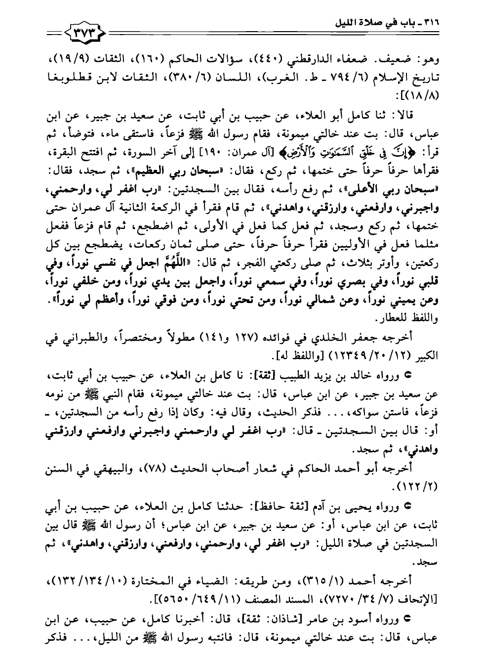 قالا: ثنا كامل أبو العلاء، عن حبيب بن أبي ثابت، عن سعيد بن جبير، عن ابن عباس، قال: بت عند خالتي ميمونة، فقام رسول الله -صلى الله عليه وسلم- فزعًا، فاستقى ماء، فتوضأ، ثم قرأ: {إِنَّ فِي خَلْقِ السَّمَاوَاتِ وَالْأَرْضِ} [آل عمران: ١٩٠] إلى آخر السورة، ثم افتتح البقرة، فقرأها حرفًا حرفًا حتى ختمها، ثم ركع، فقال: "سبحان ربي العظيم"، ثم سجد، فقال: "سبحان ربي الأعلى"، ثم رفع رأسه، فقال بين السجدتين: "رب اعفر لي، وارحمني، واجبرني، وارفعني، وارزقني، واهدني"، ثم قام فقرأ في الركعة الثانية آل عمران حتى ختمها، ثم ركع وسجد، ثم فعل كما فعل في الأولى، ثم اضطجع، ثم قام فزعًا ففعل مثلما فعل في الأوليين فقرأ حرفًا حرفًا، حتى صلى ثمان ركعات، يضطجع بين كل ركعتين، وأوتر بثلاث، ثم صلى ركعتي الفجر، ثم قال: "اللَّهُمَّ اجعل في نفسي نورًا، وفي قلبي نورًا، وفي بصري نورًا، وفي سمعي نورًا، واجعل بين يدي نورًا، ومن خلفي نورًا، وعن يميني نورًا، وعن شمالي نورًا، ومن تحتي نورًا، ومن فوقي نورًا، وأعظم لي نورًا". واللفظ للعطار.