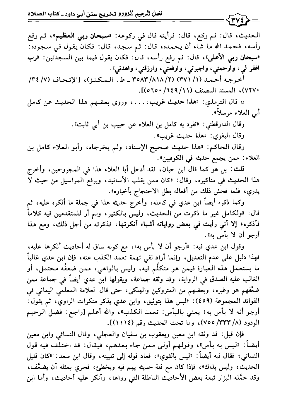 * قال الترمذي: "هذا حديث غريب، ... ، وروى بعضهم هذا الحديث عن كامل أبي العلاء مرسلًا".