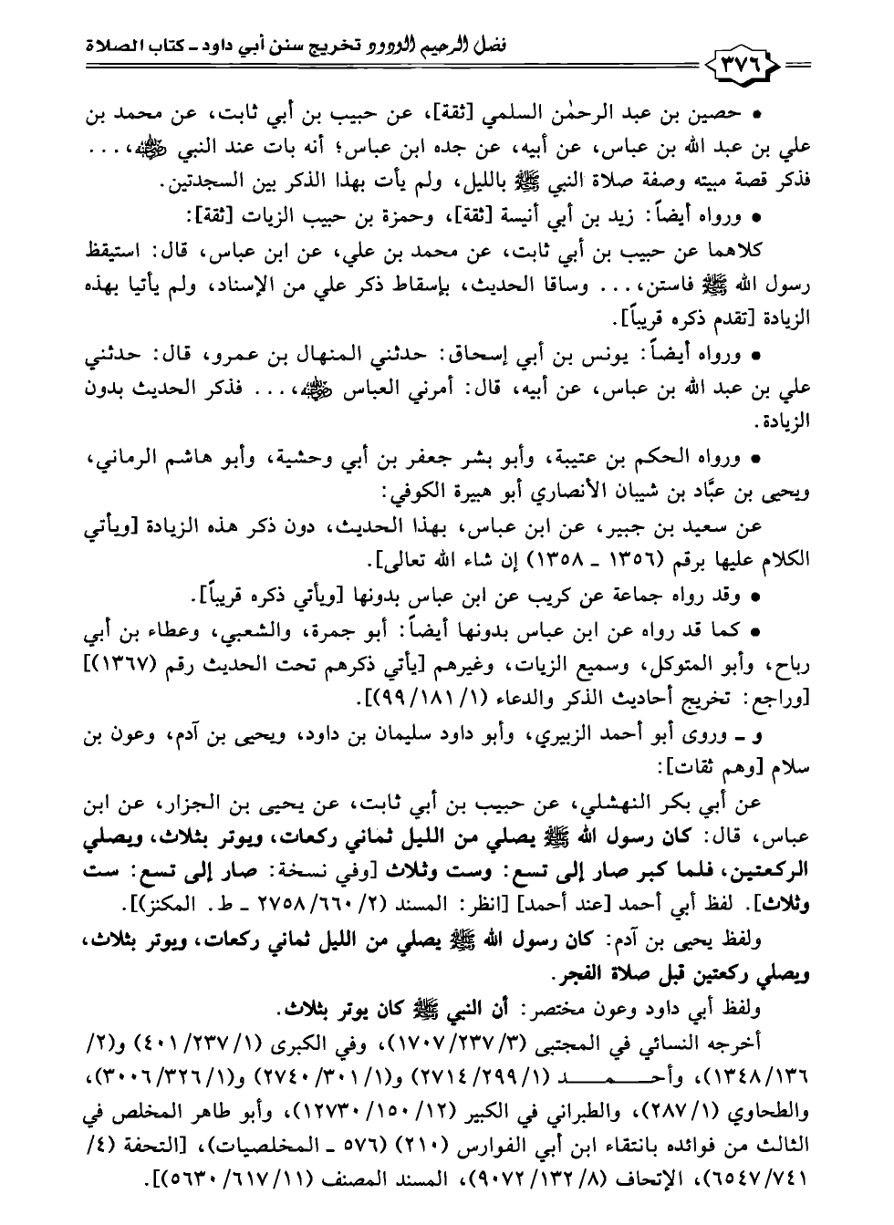 عن أبي بكر النهشلي، عن حبيب بن أبي ثابت، عن يحيى بن الجزار، عن ابن عباس، قال: كان رسول الله -صلى الله عليه وسلم- يصلي من الليل ثماني ركعات، ويوتر بثلاث، ويصلي الركعتين، فلما كبر صار إلى تسع: وست وثلاث [وفي نسخة: صار إلى تسع: ست وثلاث]. لفظ أبي أحمد [عند أحمد] [انظر: المسند (٢/ ٢٧٥٨/٦٦٠ - ط. المكنز)].