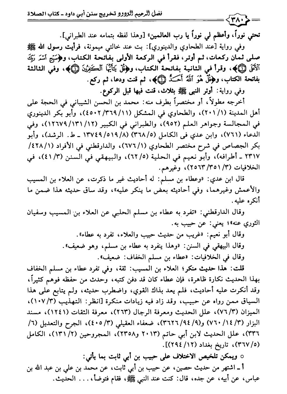 وقال الدارقطني: "تفرد به عطاء بن مسلم الحلبي عن العلاء بن المسيب وسفيان الثوري عنه"؛ يعني: عن حبيب به.
