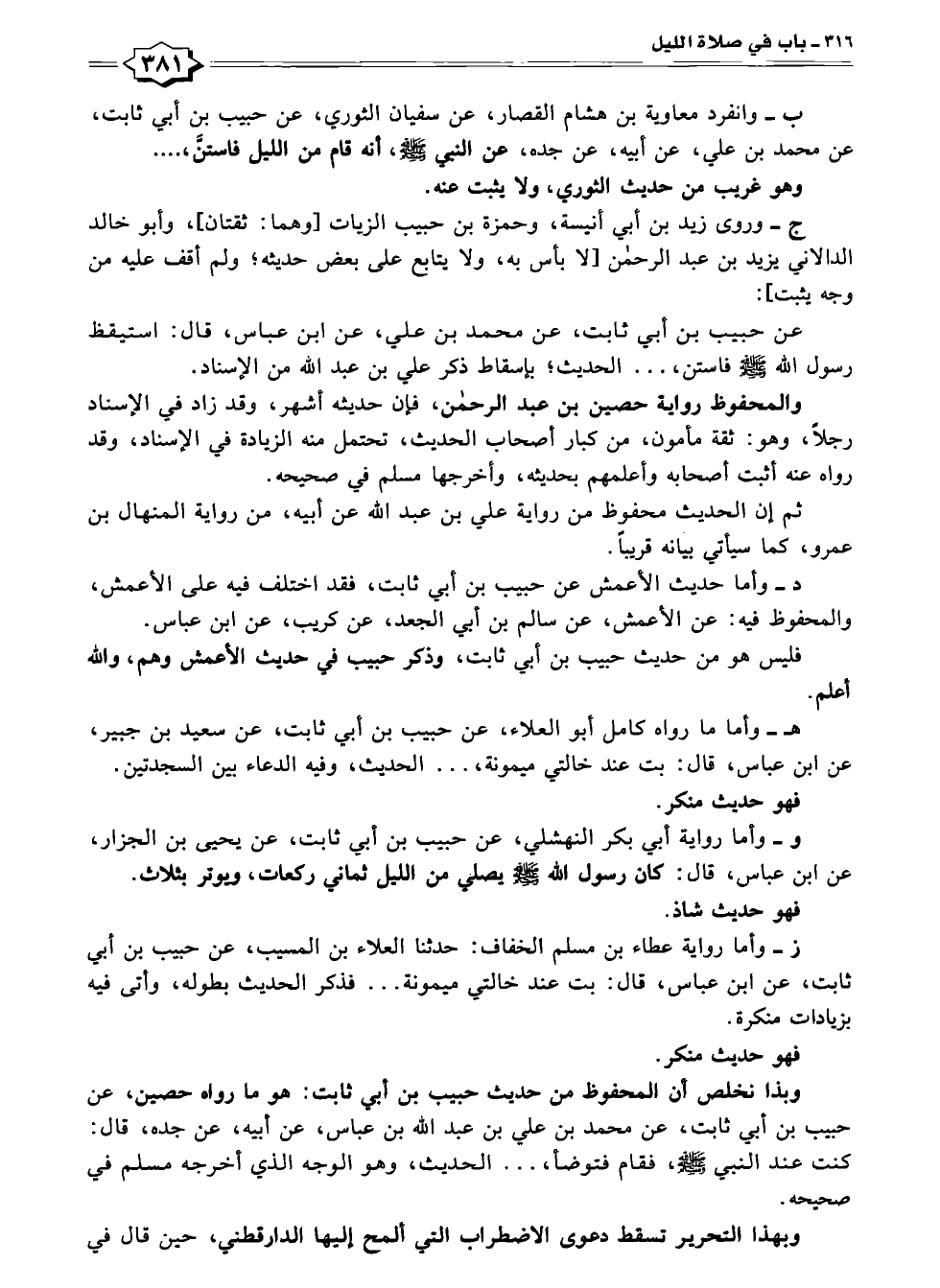 وبذا نخلص أن المحفوظ من حديث حبيب بن أبي ثابت: هو ما رواه حصين، عن حبيب بن أبي ثابت، عن محمد بن علي بن عبد الله بن عباس، عن أبيه، عن جده، قال: كنت عند النبي -صلى الله عليه وسلم-، فقام فتوضأ، ... الحديث، وهو الوجه الذي أخرجه مسلم في صحيحه.