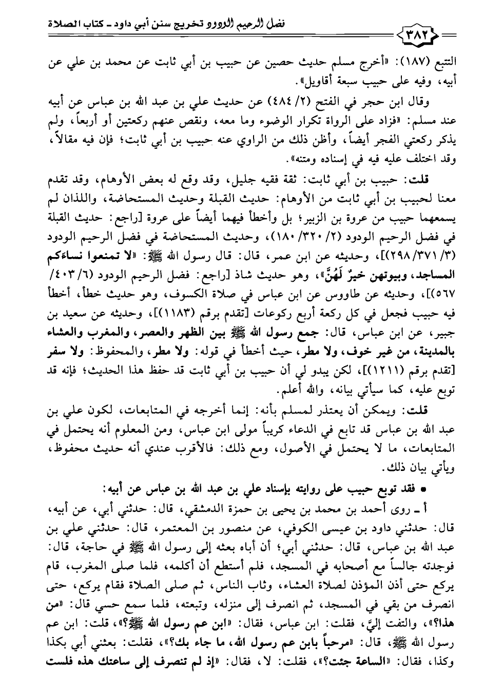 قلت: حبيب بن أبي ثابت: ثقة فقيه جليل، وقد وقع له بعض الأوهام، وقد تقدم معنا لحبيب بن أبي ثابت من الأوهام: حديث القبلة وحديث المستحاضة، واللذان لم يسمعهما حبيب من عروة بن الزبير؛ بل وأخطأ فيهما أيضًا على عروة [راجع: حديث القبلة في فضل الرحيم الودود (٢/ ٣٢٠/ ١٨٠)، وحديث المستحاضة في فضل الرحيم الودود (٣/ ٣٧١/ ٢٩٨)]، وحديثه عن ابن عمر، قال: قال رسول الله -صلى الله عليه وسلم-: "لا تمنعوا نساءَكم المساجد، وبيوتهن خيرٌ لَهُنَّ"، وهو حديث شاذ [راجع: فضل الرحيم الودود (٦/ ٤٠٣/ ٥٦٧)]، وحديثه عن طاووس عن ابن عباس في صلاة الكسوف، وهو حديث خطأ، أخطأ فيه حبيب فجعل في كل ركعة أربع ركوعات [تقدم برقم (١١٨٣)]، وحديثه عن سعيد بن جبير، عن ابن عباس، قال: جمع رسول الله -صلى الله عليه وسلم- بين الظهر والعصر، والمغرب والعشاء بالمدينة، من غير خوف، ولا مطر، حيث أخطأ في قوله: ولا مطر، والمحفوظ: ولا سفر [تقدم برقم (١٢١١)]، لكن يبدو لي أن حبيب بن أبي ثابت قد حفظ هذا الحديث؛ فإنه قد توبع عليه، كما سيأتي بيانه، والله أعلم.