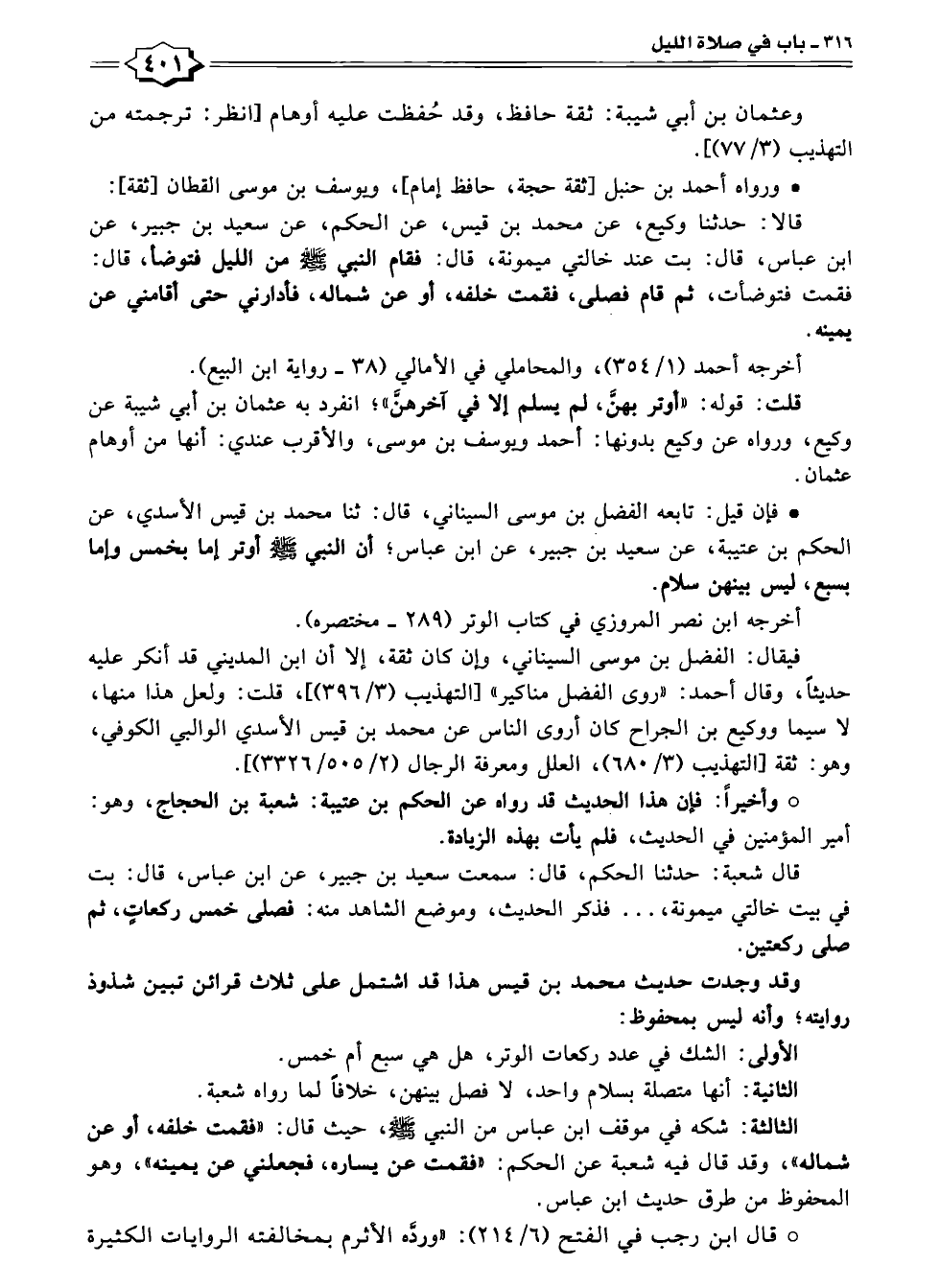 قلت: قوله: "أوتر بهنَّ، لم يسلم إلا في آخرهنَّ"؛ انفرد به عثمان بن أبي شيبة عن وكيع، ورواه عن وكيع بدونها: أحمد ويوسف بن موسى، والأقرب عندي: أنها من أوهام عثمان.