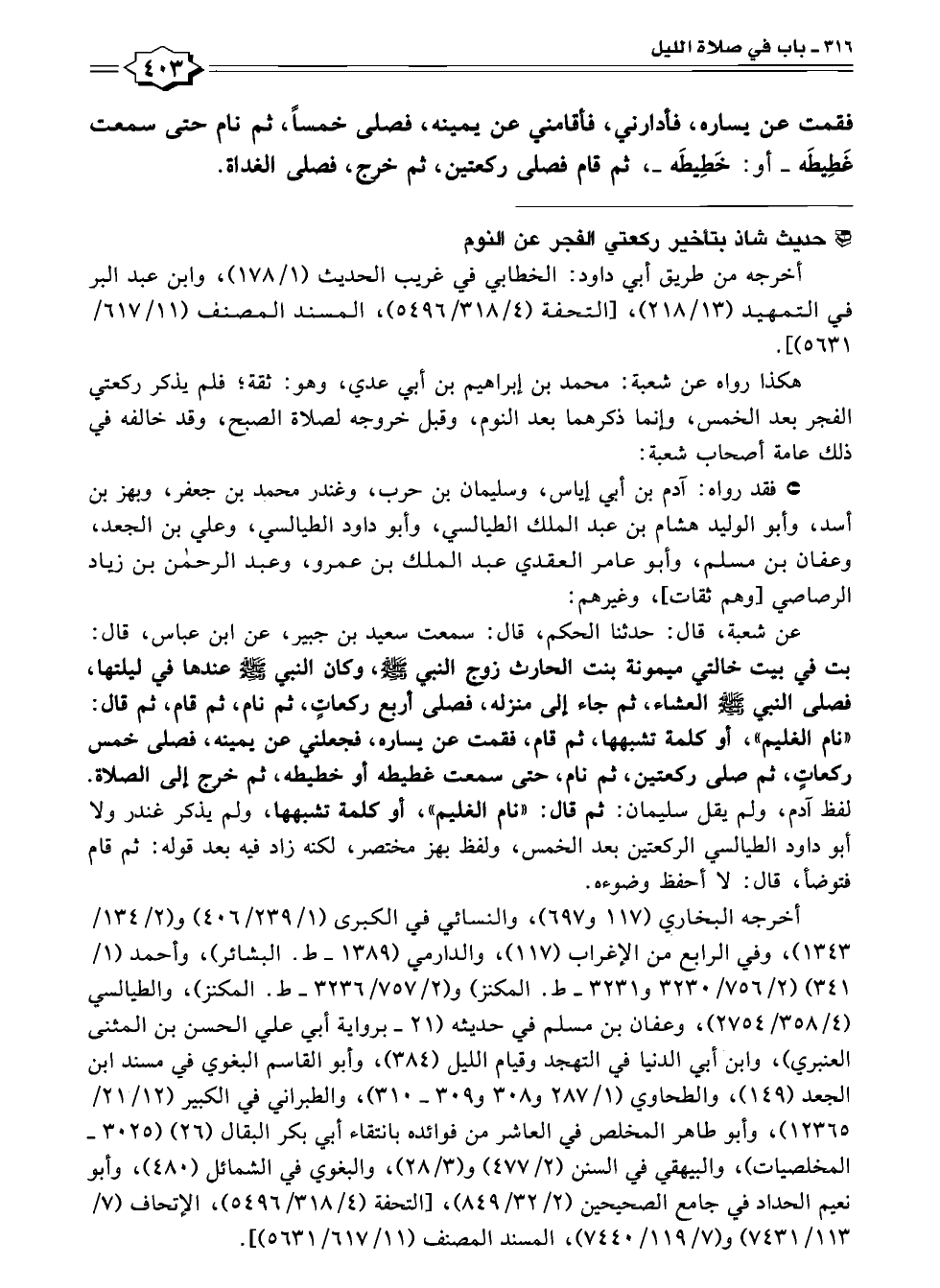 أخرجه البخاري (١١٧ و ٦٩٧)، والنسائي في الكبرى (١/ ٢٣٩/ ٤٠٦) و (٢/ ١٣٤/ ١٣٤٣)، وفي الرابع من الإغراب (١١٧)، والدارمي (١٣٨٩ - ط. البشائر)، وأحمد (١/ ٣٤١) (٢/ ٧٥٦/ ٣٢٣٠ و ٣٢٣١ - ط. المكنز) و (٢/ ٧٥٧/ ٣٢٣٦ - ط. المكنز)، والطيالسي (٤/ ٣٥٨/ ٢٧٥٤)، وعفان بن مسلم في حديثه (٢١ - برواية أبي علي الحسن بن المثنى العنبري)، وابن أبي الدنيا في التهجد وقيام الليل (٣٨٤)، وأبو القاسم البغوي في مسند ابن الجعد (١٤٩)، والطحاوي (١/ ٢٨٧ و ٣٠٨ و ٣٠٩ - ٣١٠)، والطبراني في الكبير (١٢/ ٢١/ ١٢٣٦٥)، وأبو طاهر المخلص في العاشر من فوائده بانتقاء أبي بكر البقال (٢٦) (٣٠٢٥ - المخلصيات)، والبيهقي في السنن (٢/ ٤٧٧) و (٣/ ٢٨)، والبغوي في الشمائل (٤٨٠)، وأبو نعيم الحداد في جامع الصحيحين (٢/ ٣٢/ ٨٤٩)، [التحفة (٤/ ٣١٨/ ٥٤٩٦)، الإتحاف (٧/ ١١٣/ ٧٤٣١) و (٧/ ١١٩/ ٧٤٤٠)، المسند المصنف (١١/ ٦١٧ / ٥٦٣١)].