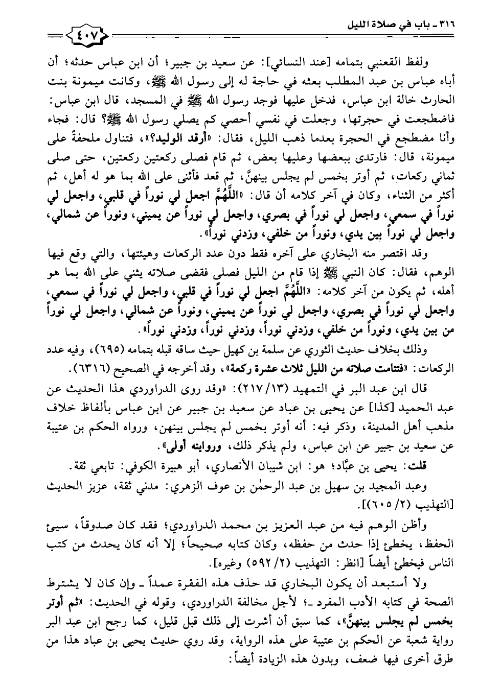 وقد اقتصر منه البخاري على آخره فقط دون عدد الركعات وهيئتها، والتي وقع فيها الوهم، فقال: كان النبي - صلى الله عليه وسلم - إذا قام من الليل فصلى فقضى صلاته يثني على الله بما هو أهله، ثم يكون من آخر كلامه: "اللُّهُمَّ اجعل لى نورًا في قلبي، واجعل لى نورًا في سمعي، واجعل لى نورًا في بصري، واجعل لى نورًا عن يميني، ونورًا عن شمالي، واجعل لى نورًا من بين يدي، ونورًا من خلفي، وزدني نورًا، وزدني نورًا، وزدني نورًا".