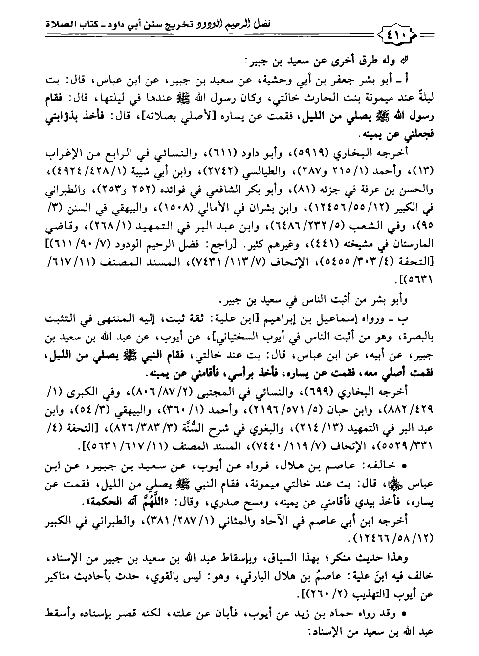 ب- ورواه إسماعيل بن إبراهيم [ابن علية: ثقة ثبت، إليه المنتهى في التثبت بالبصرة، وهو من أثبت الناس في أيوب السختياني]، عن أيوب، عن عبد الله بن سعيد بن جبير، عن أبيه، عن ابن عباس، قال: بت عند خالتي، فقام النبي - صلى الله عليه وسلم - يصلي من الليل، فقمت أصلى معه، فقمت عن يساره، فأخذ برأسي، فأقامني عن يمينه.