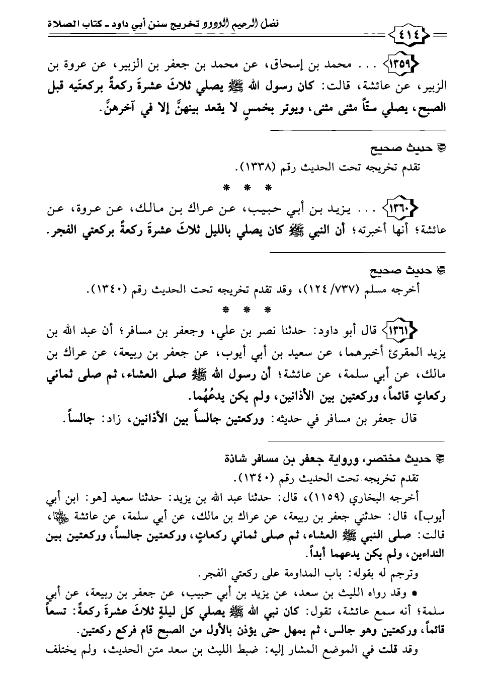 ١٣٦١ - قال أبو داود: حدثنا نصر بن علي، وجعفر بن مسافر؛ أن عبد الله بن يزيد المقرئ أخبرهما، عن سعيد بن أبي أيوب، عن جعفر بن ربيعة، عن عراك بن مالك، عن أبي سلمة، عن عائشة؛ أن رسول الله - صلى الله عليه وسلم - صلى العشاء، ثم صلى ثماني ركعاب قائمًا، وركعتين بين الأذانين، ولم يكن يدعُهُما.
