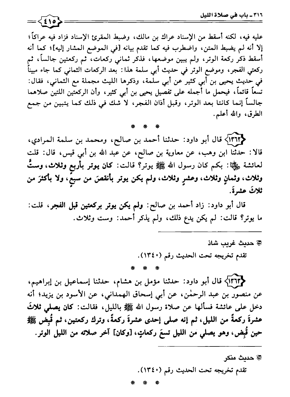 ١٣٦٣ - قال أبو داود: حدثنا مؤمل بن هشام، حدثنا إسماعيل بن إبراهيم، عن منصور بن عبد الرحمن، عن أبي إسحاق الهمداني، عن الأسود بن يزيد؛ أنه دخل على عائشة فسألها عن صلاة رسول الله - صلى الله عليه وسلم - بالليل، فقالت: كان يصلي ثلاثَ عشرةَ وكعةً من الليل، ثم إنه صلى إحدى عشرةَ ركعةً، وترك ركعتين، ثم قُبِض - صلى الله عليه وسلم - حين قُبِض، وهو يصلي من الليل تسعَ ركعاتٍ، [وكان] آخر صلاته من الليل الوتر.