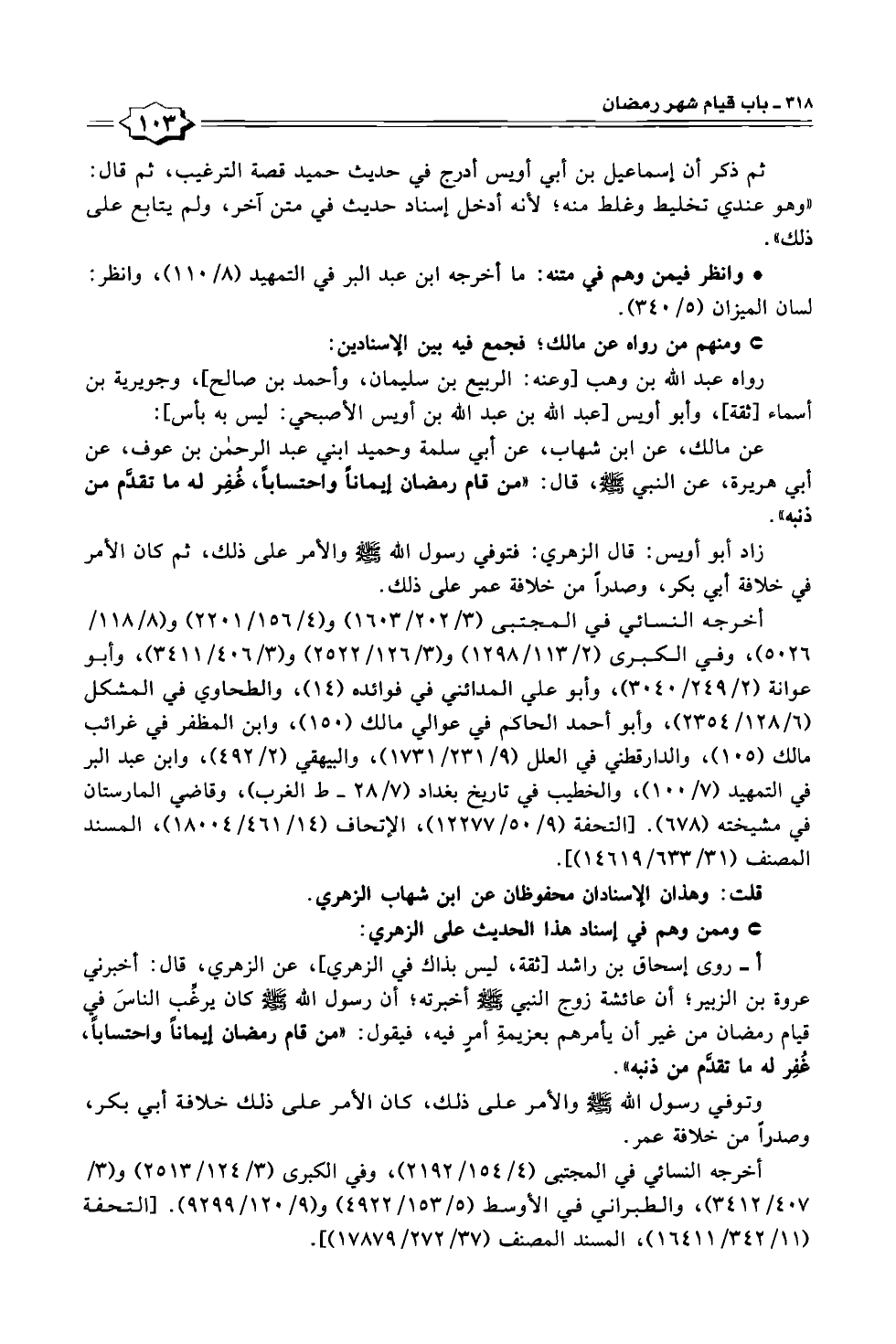 عن مالك، عن ابن شهاب، عن أبي سلمة وحميد ابني عبد الرحمن بن عوف، عن أبي "هريرة، عن النبي - صلى الله عليه وسلم -، قال "من قام رمضان ايماناً واحتساباً، غُفِر له ما تقدَّم من ذنبه".
