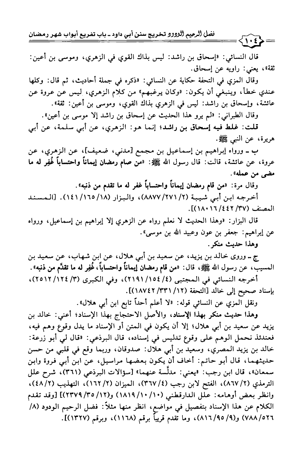 وقال المزي في التحفة حكاية عن النسائي: "ذكره في جملة أحاديث، ثم قال: وكلها عندي خطأ، وينبغي أن يكون: "وكان يرغبهم" من كلام الزهري، ليس عن عروة عن عائشة، وإسحاق بن راشد: ليس في الزهري بذاك القوي، وموسى بن أعين: ثقة".