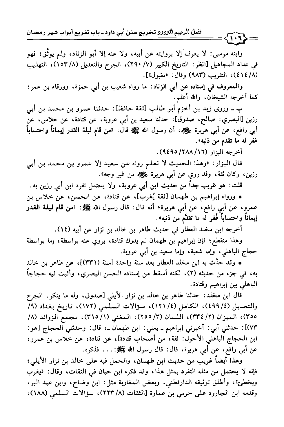 ب - وروى زيد بن أخزم أبو طالب [ثقة حافظ]: حدثنا عمرو بن محمد بن أبي رزين [البصري: صالح، صدوق]: حدثنا سعيد بن أبي عروبة، عن قتادة، عن خلاس، عن أبي رافع، عن أبي هريرة - رضي الله عنه -، أن رسول الله - صلى الله عليه وسلم - قال: "من قام ليلة القدر إيماناً واحتساباً غفر له ما تقدم من ذنبه".