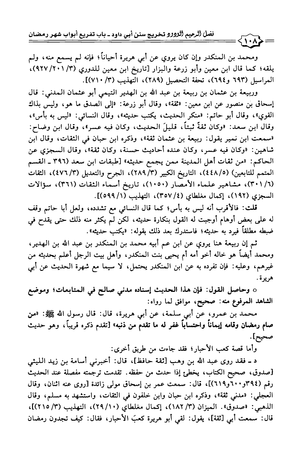 وربيعة بن عثمان بن ربيعة بن عبد الله بن الهدير التيمي أبو عثمان المدني: قال إسحاق بن منصور عن ابن معين: "ثقة"، وقال أبو زرعة: "إلى الصدق ما هو، وليس بذاك القوي"، وقال أبو حاتم: "منكر الحديث، يكتب حديثه"، وقال النسائي: "ليس به بأس"، وقال ابن سعد: "وكان ثقةً ثبتاً، قليلَ الحديث، وكان فيه عسر"، وقال ابن وضاح: "سمعت ابن نمير يقول: ربيعة بن عثمان ثقة"، وذكره ابن حبان في الثقات، وقال ابن شاهين: "وكان فيه عسر، وكان عنده أحاديث حسنة، وكان ثقة"، وقال السجزي عن الحاكم: "من ثقات أهل المدينة ممن يجمع حديثه" [طبقات ابن سعد (٣٩٦ - القسم المتمم للتابعين (٥/ ٤٤٨)، التاريخ الكبير (٣/ ٢٨٩)، الجرح والتعديل (٣/ ٤٧٦)، الثقات (٦/ ٣٠١)، مشاهير علماء الأمصار (١٠٥٠)، تاريخ أسماء الثقات (٣٦١)، سؤالات السجزي (١٩٢)، إكمال مغلطاي (٤/ ٣٥٧)، التهذيب (١/ ٥٩٩)].