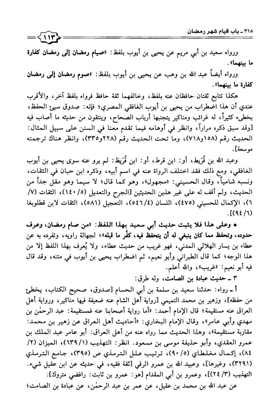 * وعلى هذا فلا يثبت حديث أبي سعيد بهذا اللفظ: "من صام رمضان، وعرف حدوده، وتحفظ مما كان ينبغي له أن يتحفظ فيه، غفر ما قبله"؛ لجهالة راويه، وتفرده به عن عطاء بن يسار الهلالي المدني، فهو غريب من حديث عطاء، ولا يُعرف بهذا اللفظ إلا من هذا الوجه؛ كما قال الطبراني وأبو نعيم، ثم اضطراب يحيى بن أيوب في متنه، وقد قال فيه أبو نعيم: "غريب"، والله أعلم.