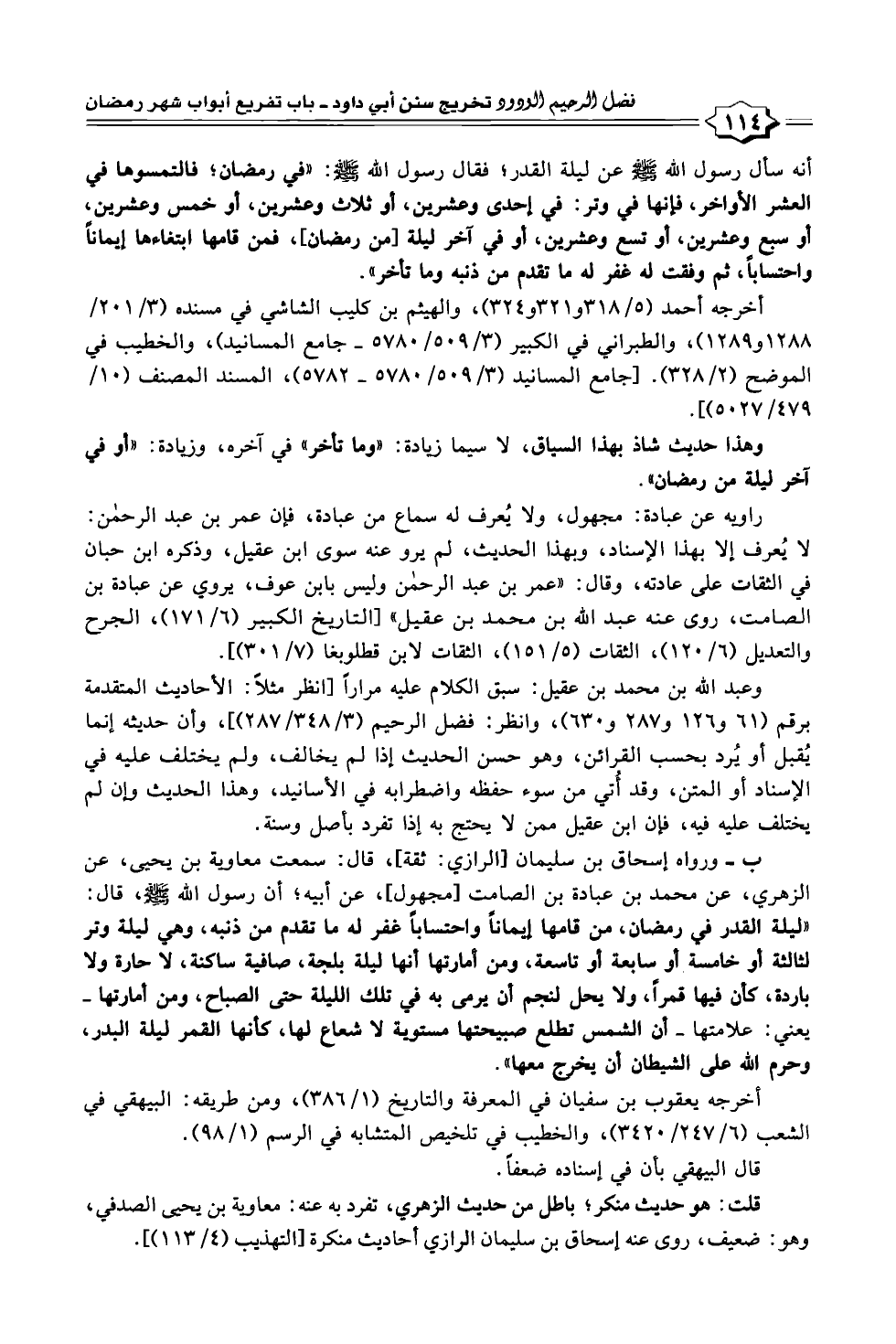 ب - ورواه إسحاق بن سليمان [الرازي: ثقة]، قال: سمعت معاوية بن يحيى، عن الزهري، عن محمد بن عبادة بن الصامت [مجهول]، عن أبيه؛ أن رسول الله - صلى الله عليه وسلم -، قال: "ليلة القدر في رمضان، من قامها إيماناً واحتساباً غفر له ما تقدم من ذنبه، وهي ليلة وتر لثالثة أو خامسة أو رابعة أو تاسعة، ومن أمارتها أنها ليلة بلجة، صافية ساكنة، لا حارة ولا باردة، كأن فيها قمراً، ولا يحل لنجم أن يرمى به في تلك الليلة حتى الصباح، ومن أمارتها - يعني: علامتها - أن الشمس تطلع صبيحتها مستوية لا شعاع لها، كأنها القمر ليلة البدر، وحرم الله على الشيطان أن يخرج معها".