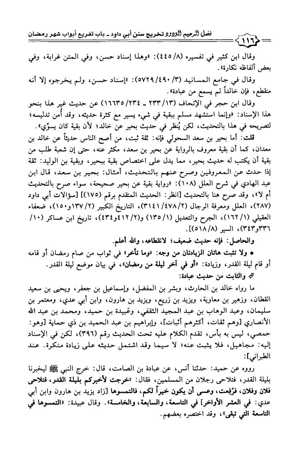 * ولا تثبت هاتان الزيادتان من وجه: "وما تأخر" في ثواب من صام رمضان أو قامه أو قام ليلة القدر، وزيادة: "أو في أخر ليلة من رمضان"، في بيان موضع ليلة القدر.