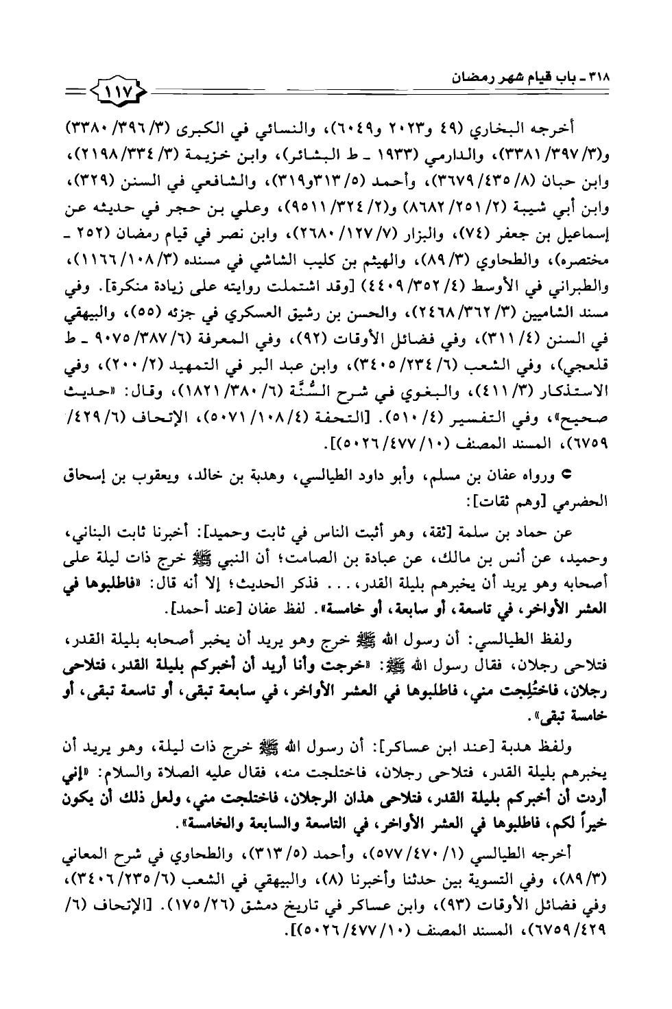 عن حماد بن سلمة [ثقة، وهو أثبت الناس في ثابت وحميد]: أخبرنا ثابت البناني، وحميد، عن أنس بن مالك، عن عبادة بن الصامت؛ أن النبي - صلى الله عليه وسلم - خرج ذات ليلة على أصحابه وهو يريد أن يخبرهم بليلة القدر، ... فذكر الحديث؛ إلا أنه قال: "فاطلبوها في العشر الأواخر، في تاسعة، أو سابعة، أو خامسة". لفظ عفان [عند أحمد].
