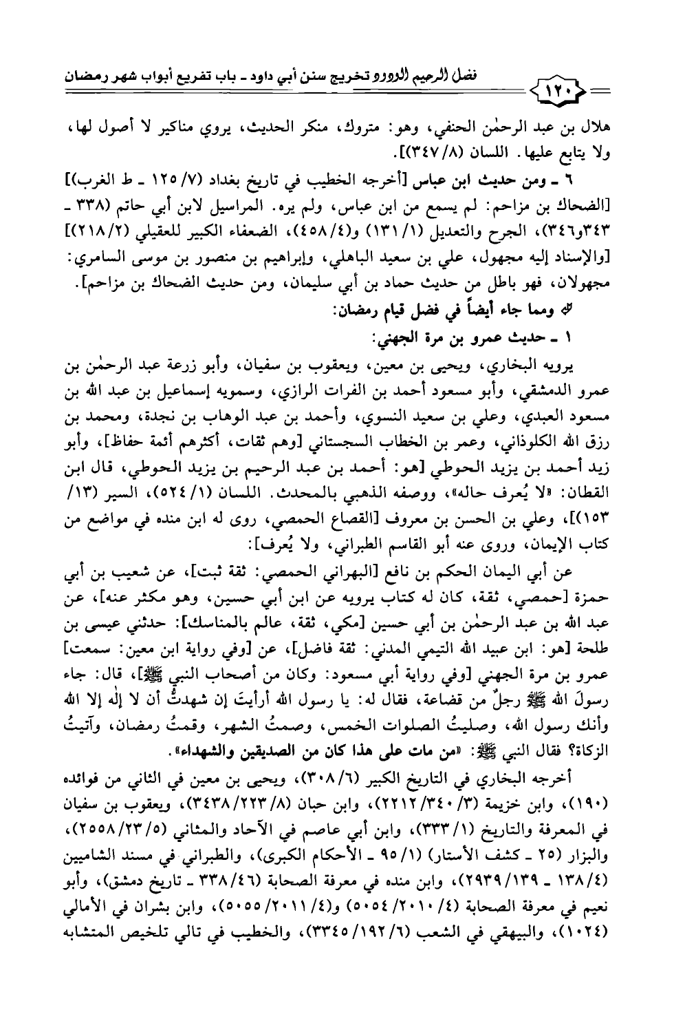 عن أبي اليمان الحكم بن نافع [البهراني الحمصي: ثقة ثبت]، عن شعيب بن أبي حمزة [حمصي، ثقة، كان له كتاب يرويه عن ابن أبي حسين، وهو مكثر عنه]، عن عبد الله بن عبد الرحمن بن أبي حسين [مكي، ثقة، عالم بالمناسك]: حدثني عيسى بن طلحة [هو: ابن عبيد الله التيمي المدني: ثقة فاضل]، عن [وفي رواية ابن معين: سمعت، عمرو بن مرة الجهني [وفي رواية أبي مسعود: وكان من أصحاب النبي - صلى الله عليه وسلم -]، قال: جاء رسولَ الله - صلى الله عليه وسلم - رجل من قضاعة، فقال له: يا رسول الله أرأيتَ إن شهدتُّ أن لا إله إلا الله وأنك رسول الله، وصليتُ الصلوات الخمس، وصمتُ الشهر، وقمتُ رمضان، وآتيتُ الزكاة؟ فقال النبي - صلى الله عليه وسلم -: "من مات على هذا كان من الصديقين والشهداء".