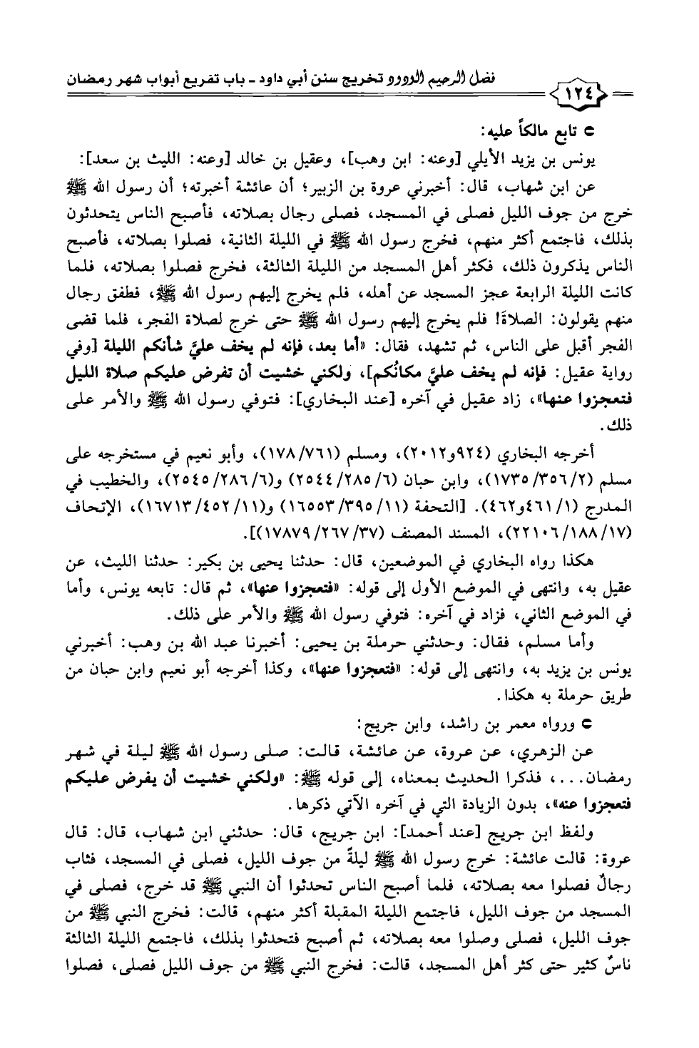 يونس بن يزيد الأيلي [وعنه: ابن وهب]، وعقيل بن خالد [وعنه: الليث بن سعد]: عن ابن شهاب، قال: أخبرني عروة بن الزبير؛ أن عائشة أخبرته؛ أن رسول الله - صلى الله عليه وسلم - خرج من جوف الليل فصلى في المسجد، فصلى رجال بصلاته، فأصبح الناس يتحدثون بذلك، فاجتمع أكثر منهم، فخرج رسول الله - صلى الله عليه وسلم - في الليلة الثانية، فصلوا بصلاته، فأصبح الناس يذكرون ذلك، فكثر أهل المسجد من الليلة الثالثة، فخرج فصلوا بصلاته، فلما كانت الليلة الرابعة عجز المسجد عن أهله، فلم يخرج إليهم رسول الله - صلى الله عليه وسلم -، فطفق رجال منهم يقولون: الصلاةَ! فلم يخرج إليهم رسول الله - صلى الله عليه وسلم - حتى خرج لصلاة الفجر، فلما قضى الفجر أقبل على الناس، ثم تشهد، فقال: "أما بعد، فإنه لم يخف عليَّ شأنكم الليلة [وفي رواية عقيل: فإنه لم يخف عليَّ مكانُكم]، ولكني خشيت أن تفرض عليكم صلاة الليل فتعجزوا عنها"، زاد عقيل في آخره [عند البخاري]: فتوفي رسول الله - صلى الله عليه وسلم - والأمر على ذلك.