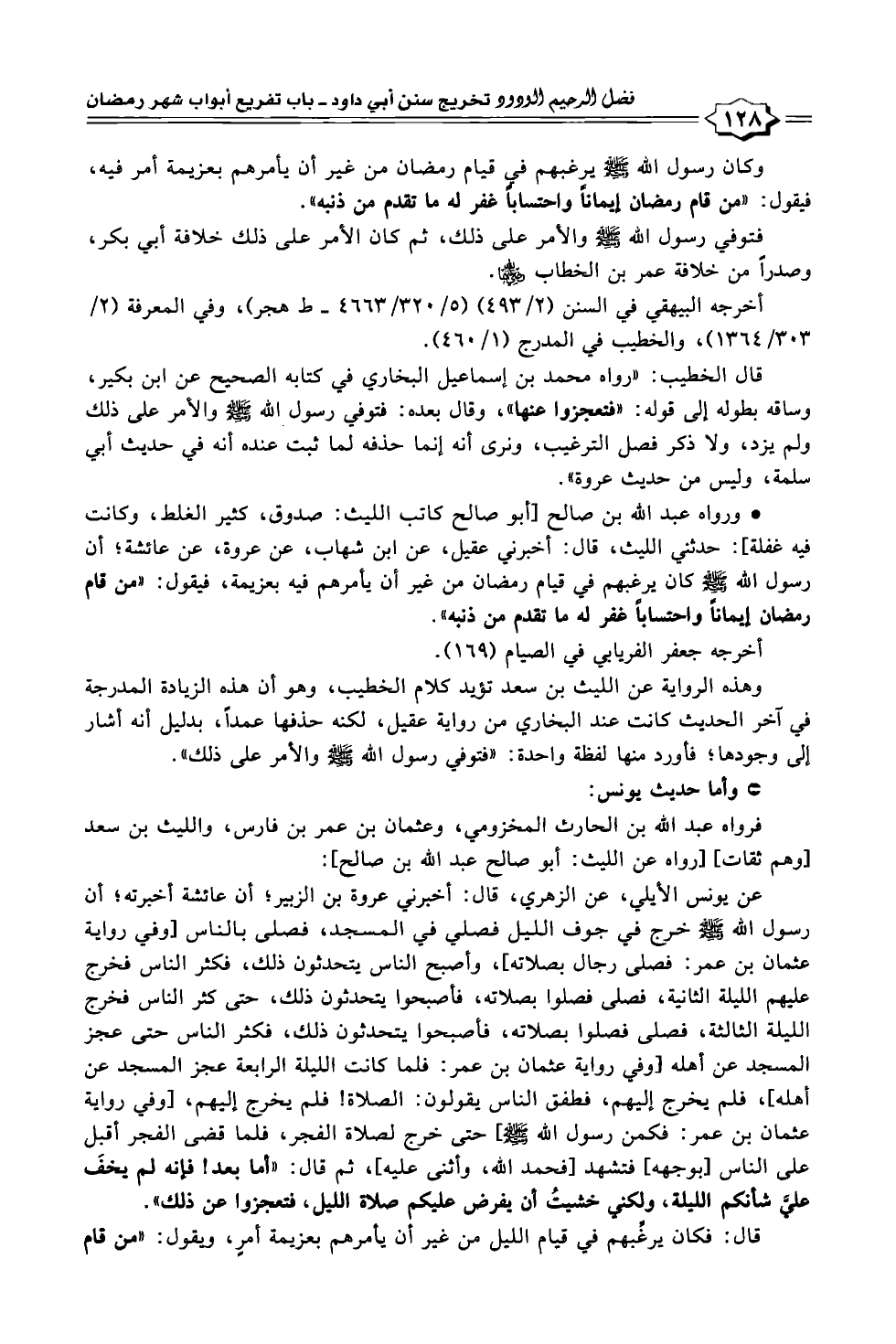 * ورواه عبد الله بن صالح [أبو صالح كاتب الليث: صدوق، كثير الغلط، وكانت فيه غفلة]: حدثني الليث، قال: أخبرني عقيل، عن ابن شهاب، عن عروة، عن عائشة؛ أن رسول الله - صلى الله عليه وسلم - كان يرغبهم في قيام رمضان من غير أن يأمرهم فيه بعزيمة، فيقول: "من قام رمضان إيماناً واحتساباً غفر له ما تقدم من ذنبه".