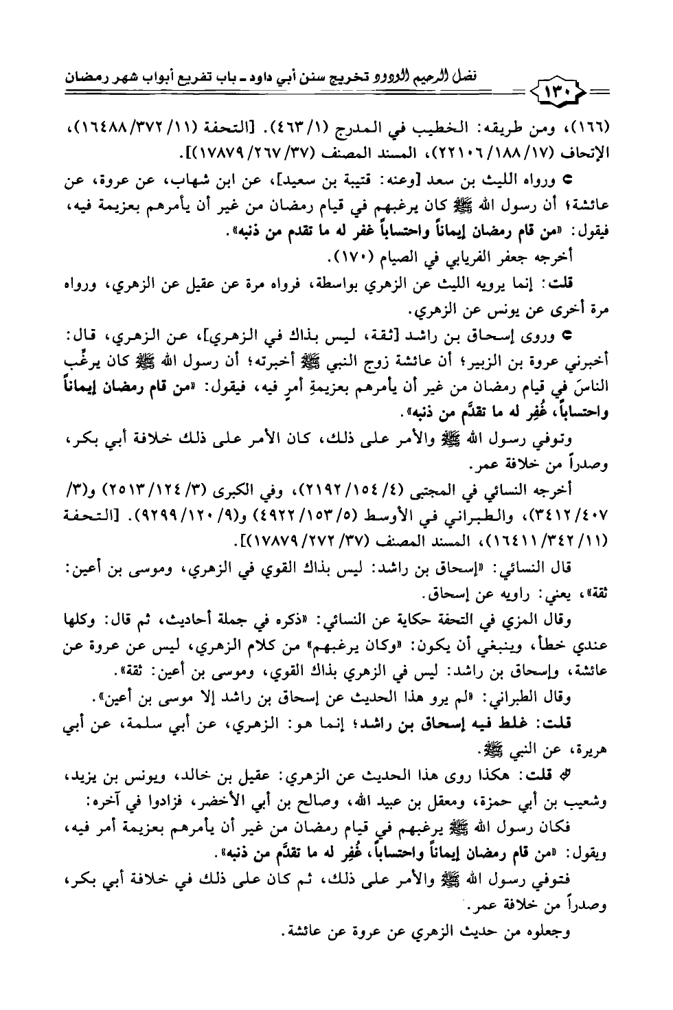 وروى إسحاق بن راشد [ثقة، ليس بذاك في الزهري]، عن الزهري، قال: أخبرني عروة بن الزبير؛ أن عائشة زوج النبي - صلى الله عليه وسلم - أخبرته؛ أن رسول الله - صلى الله عليه وسلم - كان يرغِّب الناسَ في قيام رمضان من غير أن يأمرهم بعزيمةِ أمرٍ فيه، فيقول: "من قام رمضان إيماناً واحتساباً، غُفِر له ما تقدَّم من ذنبه".