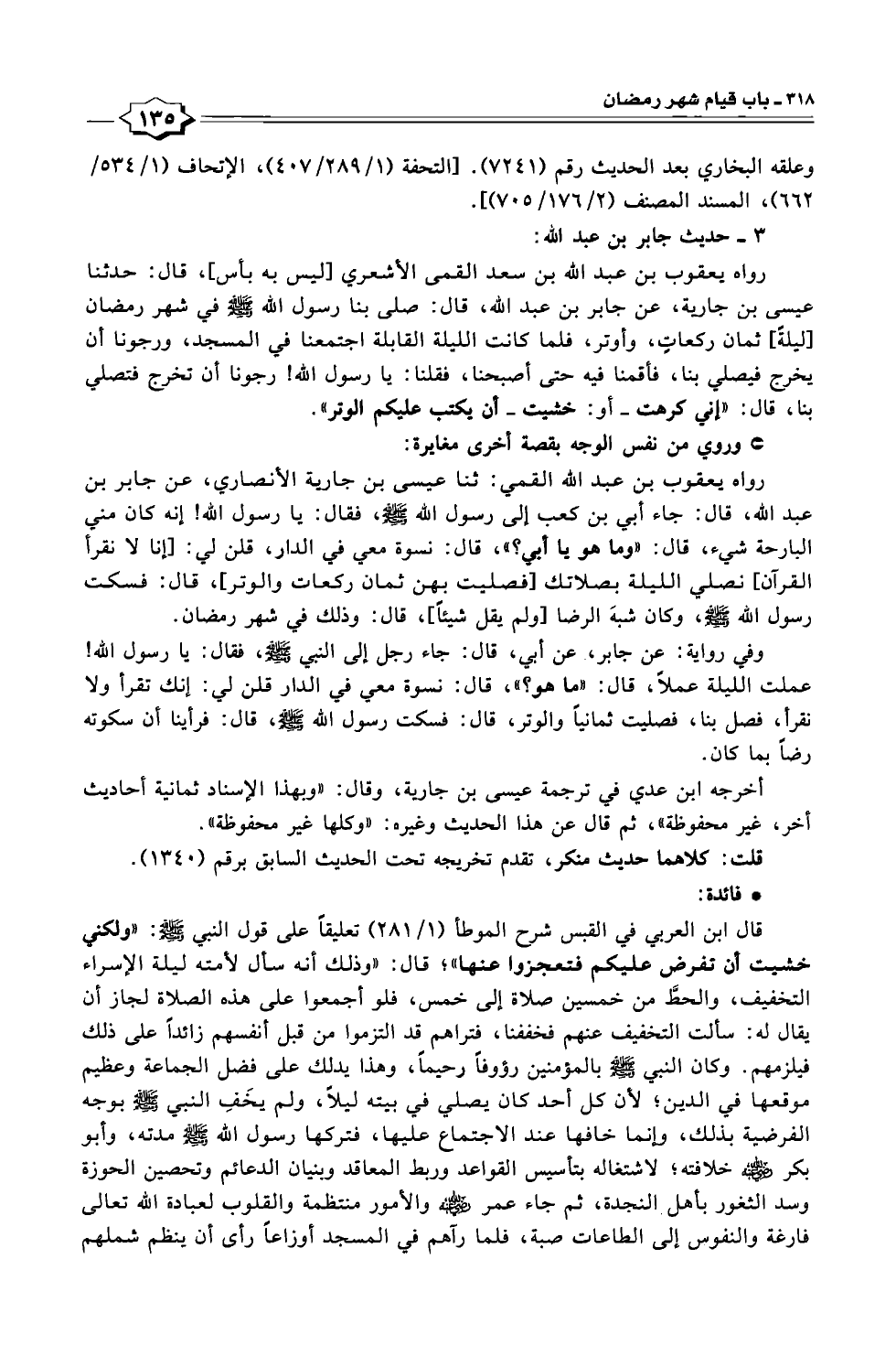 وفي رواية: عن جابر، عن أبي، قال: جاء رجل إلى النبي - صلى الله عليه وسلم -، فقال: يا رسول الله! عملت الليلة عملاً، قال: "ما هو؟ "، قال: نسوة معي في الدار قلن لي: إنك تقرأ ولا نقرأ، فصل بنا، فصليت ثمانياً والوتر، قال: فسكت رسول الله - صلى الله عليه وسلم -، قال: فرأينا أن سكوته رضاً بما كان.
