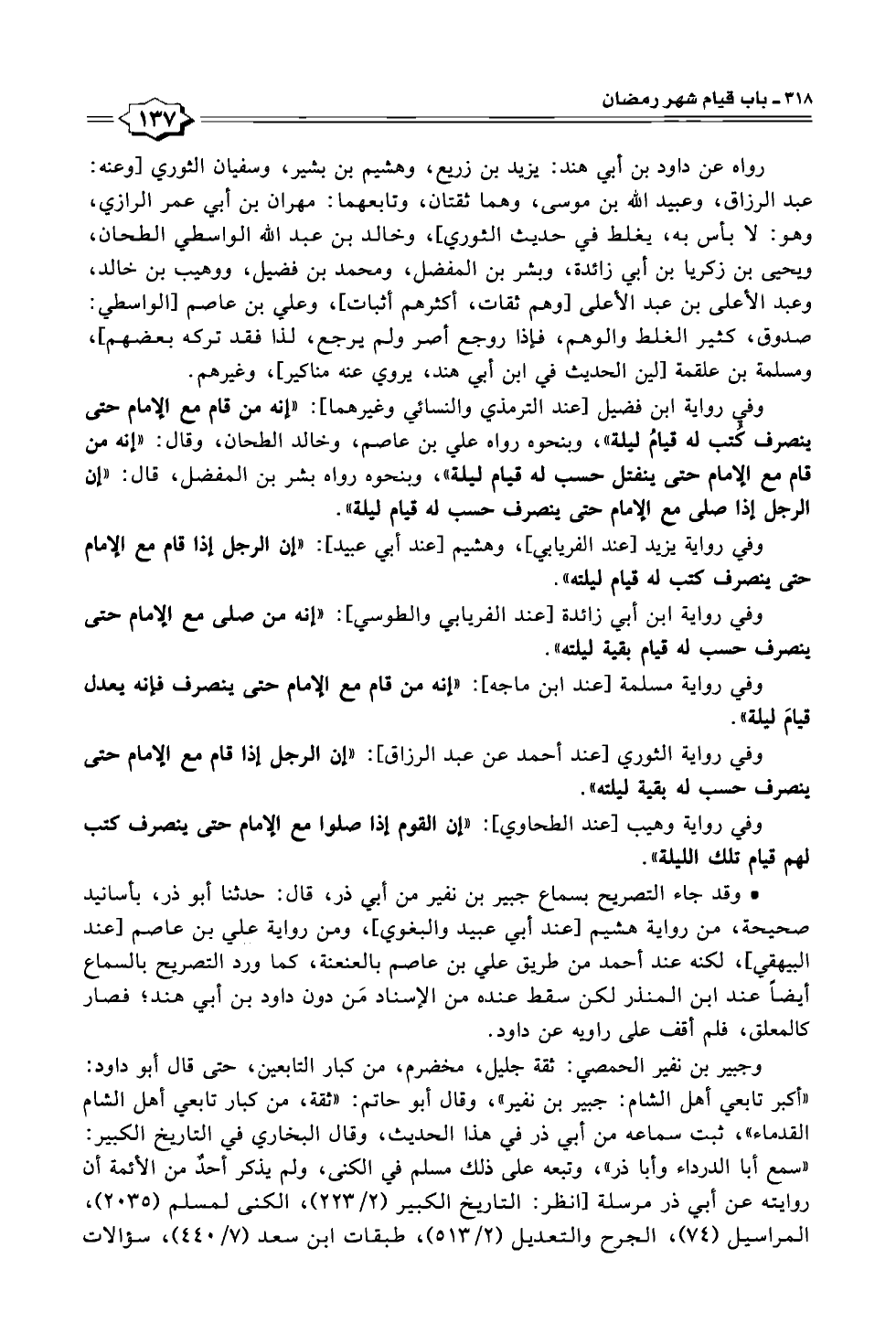 وفى رواية ابن فضيل [عند الترمذي والنسائي وغيرهما]: "إنه من قام مع الإمام حتى ينصرف كتب له قيامُ ليلتة" وبنحوه رواه علي بن عاصم، وخالد الطحان، وقال: "إنه من قام مع الإمام حتى ينفتل حسب له قيام ليلة"، وبنحوه رواه بشر بن المفضل، قال: "إن الرجل إذا صلى مع الإمام حتى ينصرف حسب له قيام ليلة".