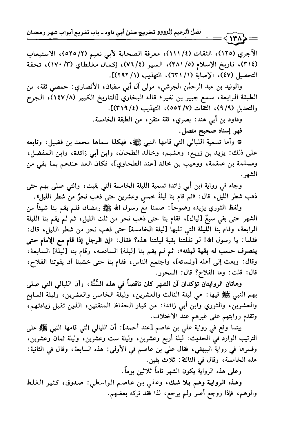 وهاتان الروايتان تؤكدان أن الشهر كان ناقصاً في هذه السُّنَّة، وأن الليالي التي صلى بهم النبي - صلى الله عليه وسلم - فيها: هي ليلة الثالث والعشرين، وليلة الخامس والعشرين، وليلة السابع والعشرين، والثوري وابن أبي زائدة: من كبار الحفاظ المتقنين، الذين تقبل زيادتهم، وتقدم روايتهم على غيرهم عند الاختلاف.