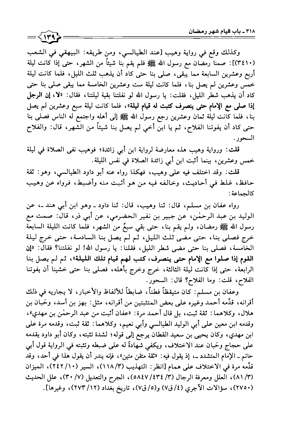 رواه عفان بن مسلم، قال: ثنا وهيب، قال: ثنا داود - وهو ابن أبي هند -، عن الوليد بن عبد الرحمن، عن جبير بن نفير الحضرمي، عن أبي ذر، قال: صمت مع رسول الله - صلى الله عليه وسلم - رمضان، ولم يقم بنا، حتى بقي سبعٌ من الشهر، فلما كانت الليلة السابعة خرج فصلى بنا، حتى مضى ثلث الليل، ثم لم يصل بنا السادسة، حتى خرج ليلة الخامسة، فصلى بنا حتى مضى شطر الليل، فقلنا: يا رسول الله! لو نفلتنا؟ فقال: "إن القوم إذا صلوا مع الإمام حتى ينصرف، كتب لهم قيام تلك الليلة"، ثم لم يصل بنا الرابعة، حتى إذا كانت ليلة الثالثة، خرج وخرج بأهله، فصلى بنا حتى خشينا أن يفوتنا الفلاح، قلت: وما الفلاح؟ قال: السحور.