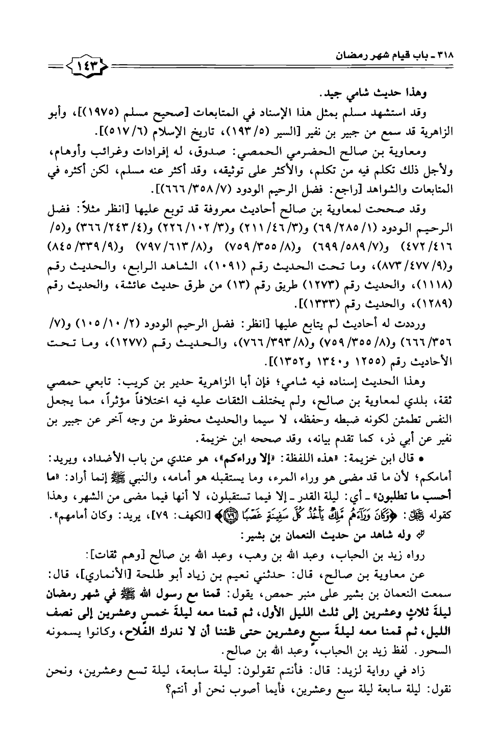 عن معاوية بن صالح، قال: حدثني نعيم بن زياد أبو طلحة [الأنماري]، قال: سمعت النعمان بن بشير على منبر حمص، يقول: قمنا مع رسول الله - صلى الله عليه وسلم - في شهر رمضان ليلةَ ثلاثٍ وعشرين إلى ثلث الليل الأول، ثم قمنا معه ليلةَ خمسٍ وعشرين إلى نصف الليل، ثم قمنا معه ليلةَ سبعٍ وعشرين حتى ظننا أن لا ندرك الفلاح، وكانوا يسمونه السحور. لفظ زيد بن الحباب، وعبد الله بن صالح.