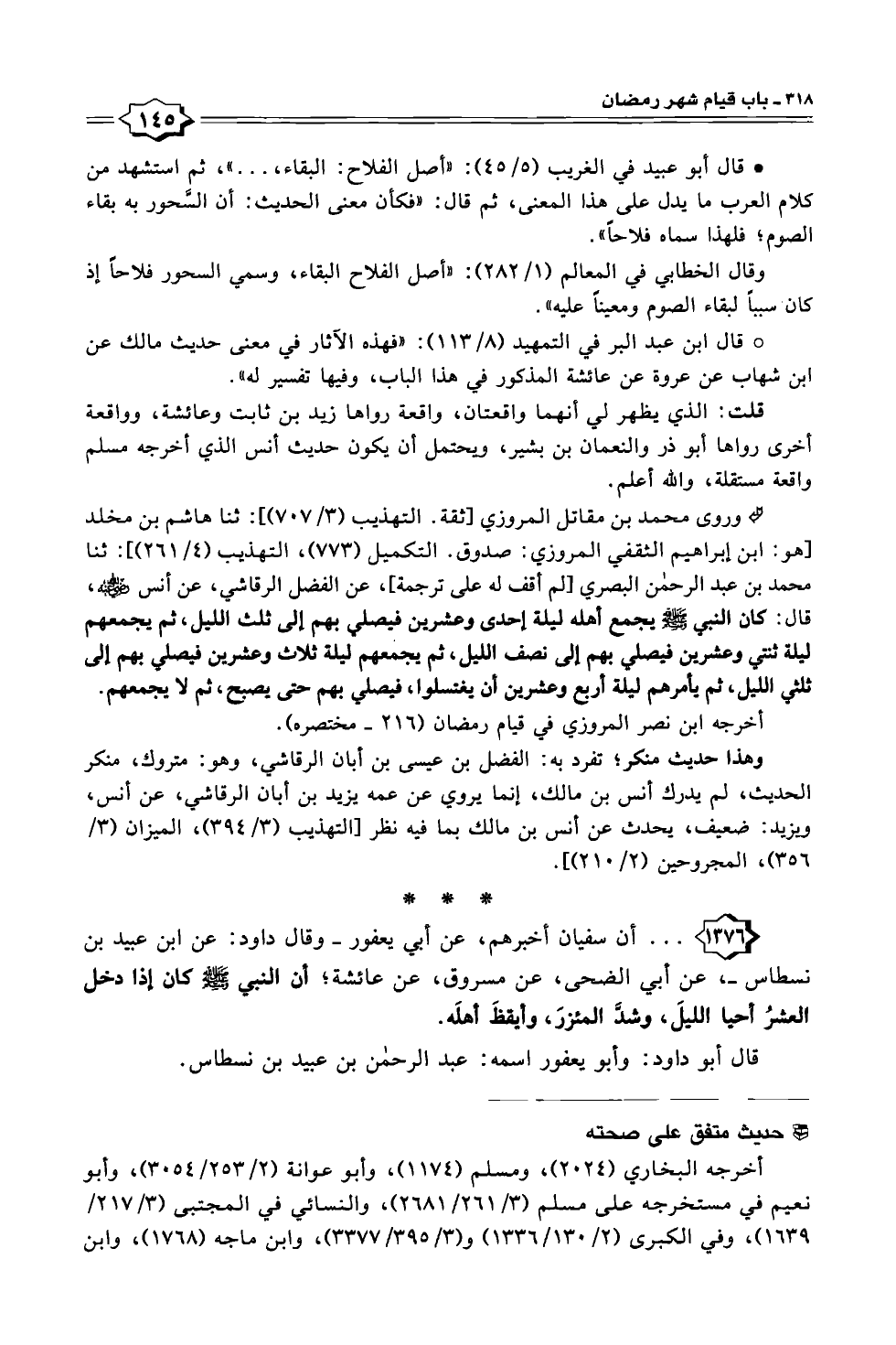 ١٣٧٦ - . . . أن سفيان أخبرهم، عن أبي يعفور -وقال داود: عن ابن عبيد بن نسطاس-، عن أبي الضحى، عن مسروق، عن عائشة، أن النبي -صلى الله عليه وسلم- كان إذا دخل العشرُ أحيا الليلَ، وشدَّ المئزرَ، وأيقظَ أهلَه.