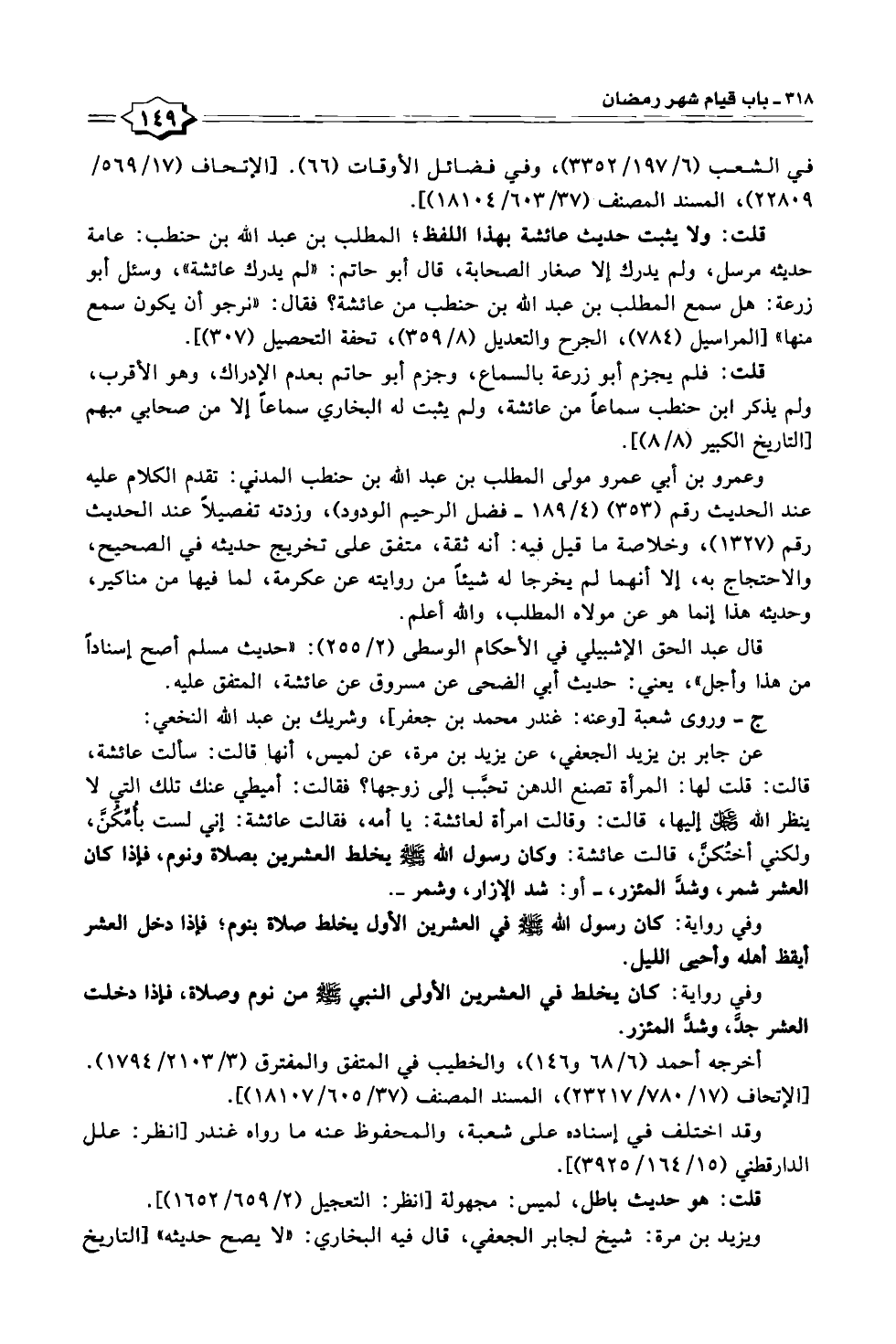 عن جابر بن يزيد الجعفي، عن يزيد بن مرة، عن لميس، أنها قالت: سألت عائشة، قالت: قلت لها: المرأة تصنع الدهن تحبَّب إلى زوجها؟ فقالت: أميطي عنك تلك التى لا ينظر الله عزَّ وجلَّ إليها، قالت: وقالت امرأة لعائشة: يا أمه، فقالت عائشة: إني لست بأمِّكُنَّ، ولكني أختُكنَّ، قالت عائشة: وكان وسول الله -صلى الله عليه وسلم- يخلط العشرين بصلاة ونوم، فإذا كان العشر شمر، وشدَّ المئزر، -أو: شدا الإزار، وشمر-.