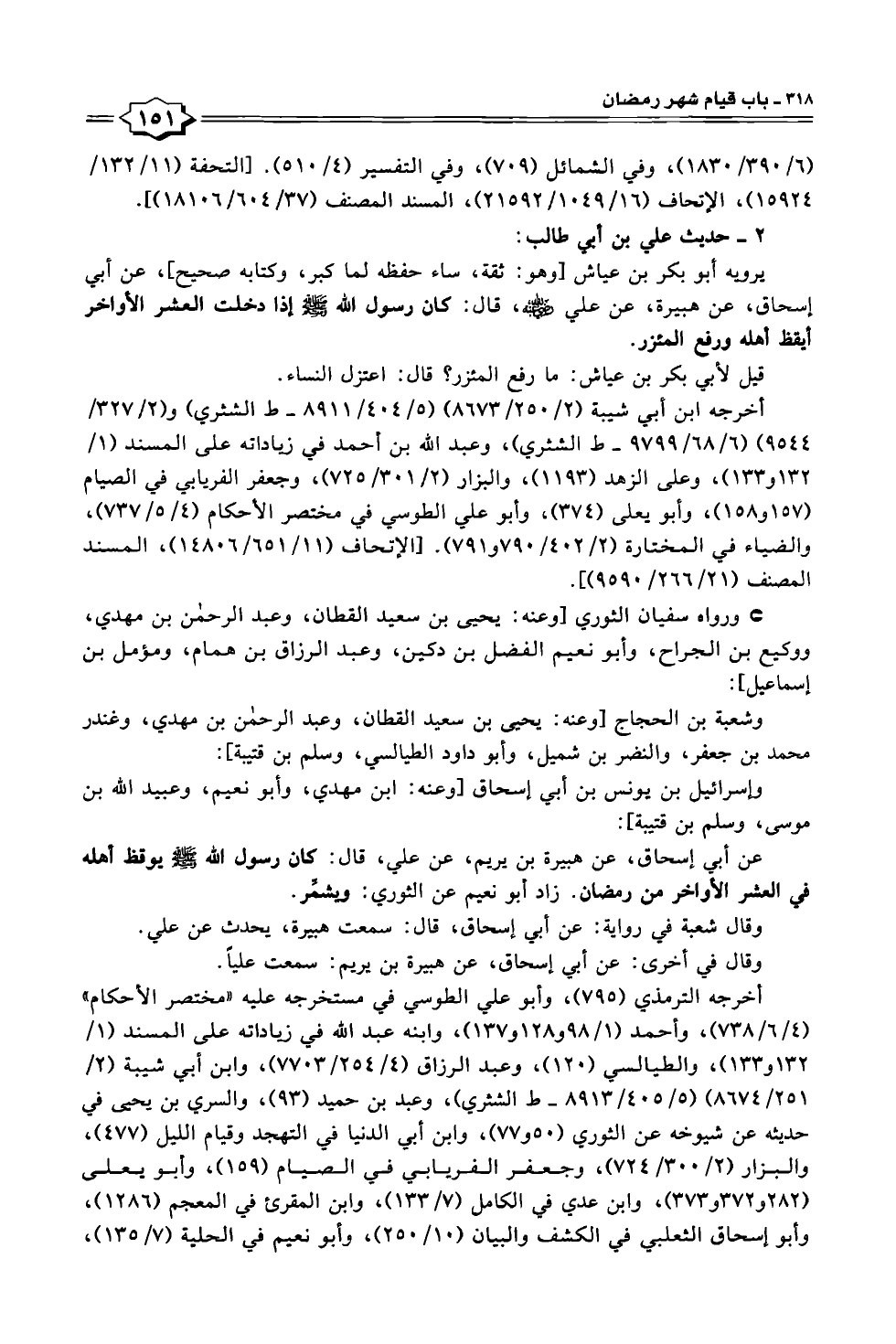 عن أبي إسحاق، عن هبيرة بن يريم، عن علي، قال: كان رسول الله -صلى الله عليه وسلم- يوقظ أهله في العشر الأواخر من رمضان. زاد أبو نعيم عن الثوري: ويشمِّر.