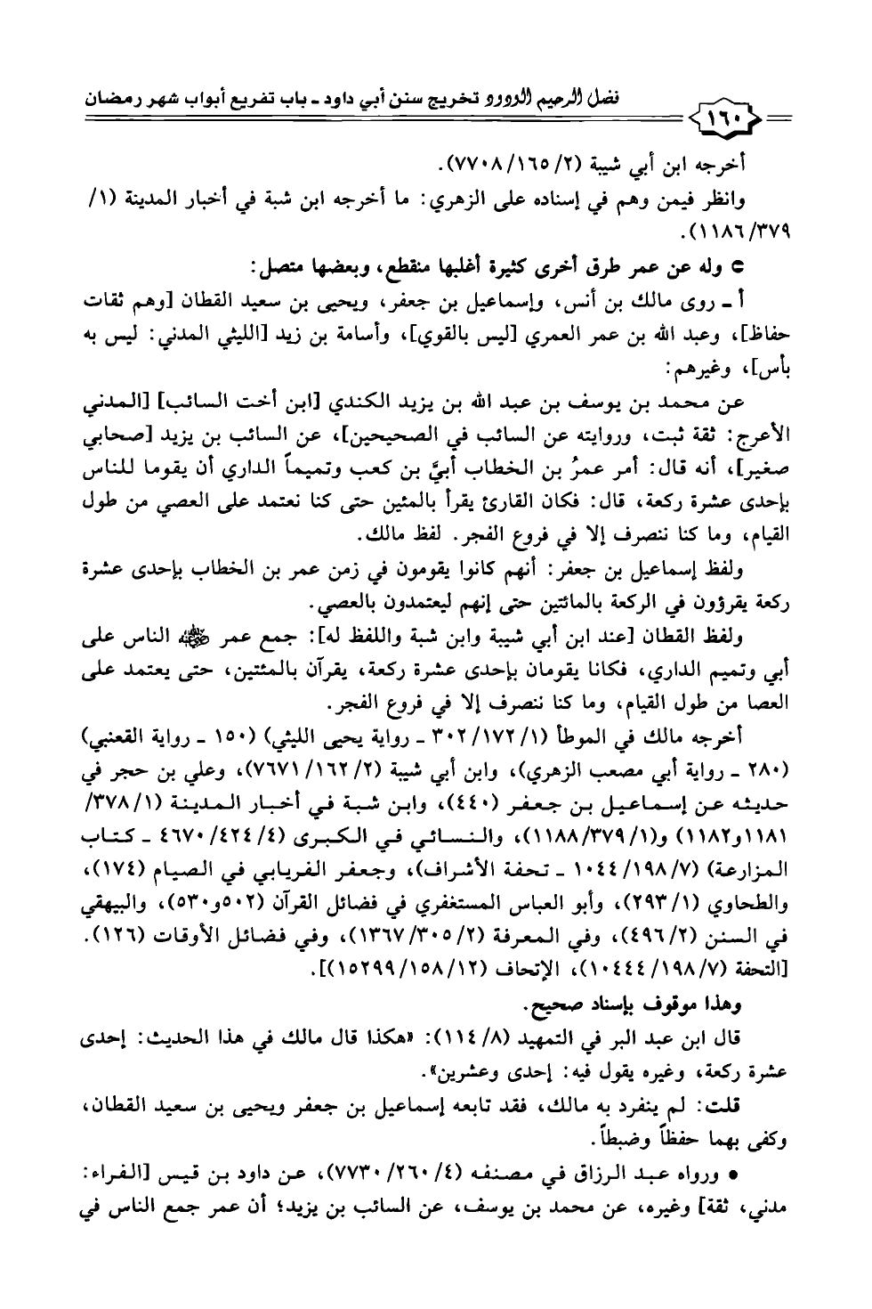 • ورواه عبد الرزاق في مصنفه (٤/ ٢٦٠/ ٧٧٣٠)، عن داود بن قيس [الفراء: مدني، ثقة] وغيره، عن محمد بن يوسف، عن السائب بن يزيد؛ أن عمر جمع الناس في