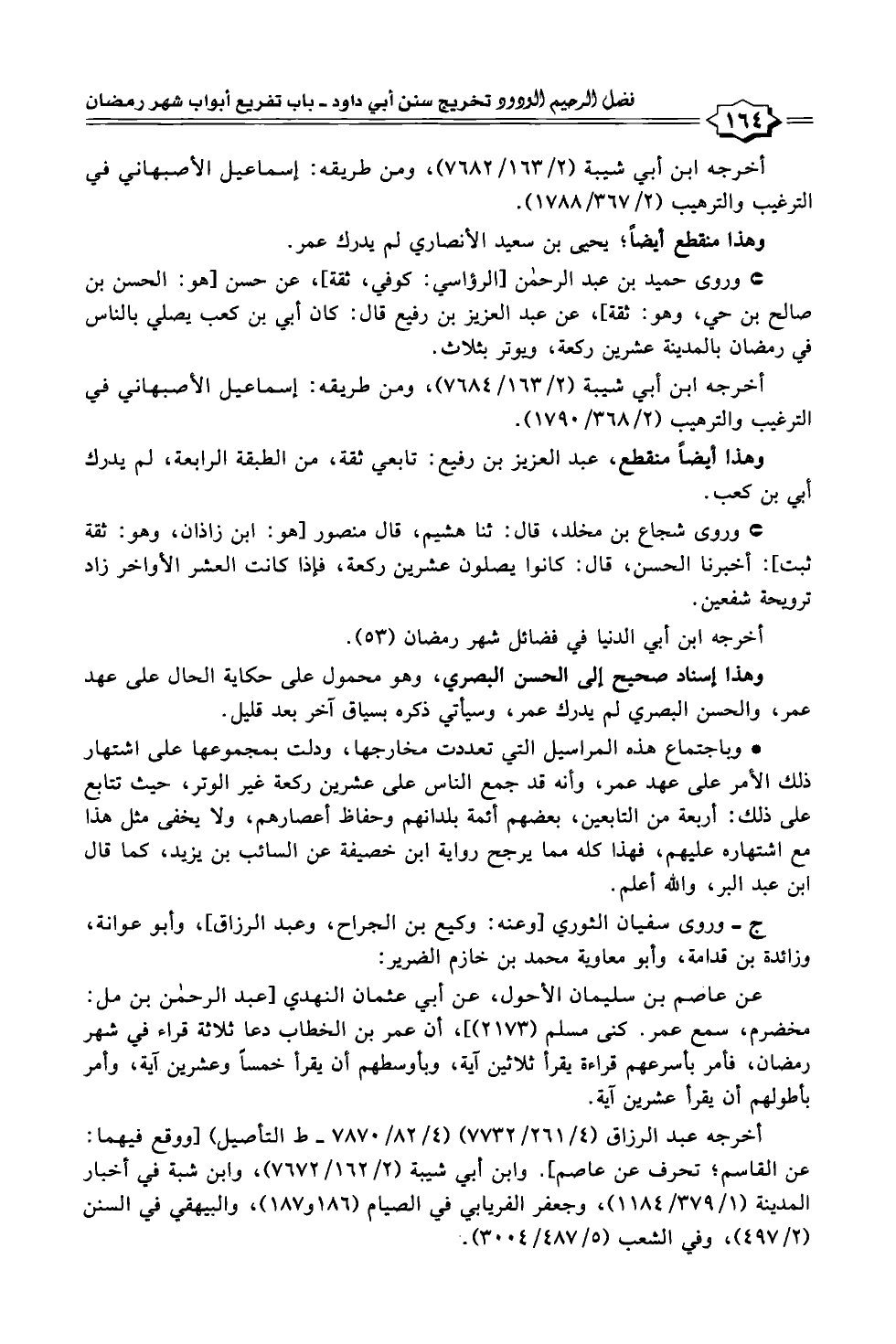 • وباجتماع هذه المراسيل التي تعددت مخارجها، ودلت بمجموعها على اشتهار ذلك الأمر على عهد عمر، وأنه قد جمع الناس على عشرين ركعة غير الوتر، حيث تتابع على ذلك: أربعة من التابعين، بعضهم أئمة بلدانهم وحفاظ أعصارهم، ولا يخفى مثل هذا مع اشتهاره عليهم، فهذا كله مما يرجح رواية ابن خصيفة عن السائب بن يزيد، كما قال ابن عبد البر، والله أعلم.