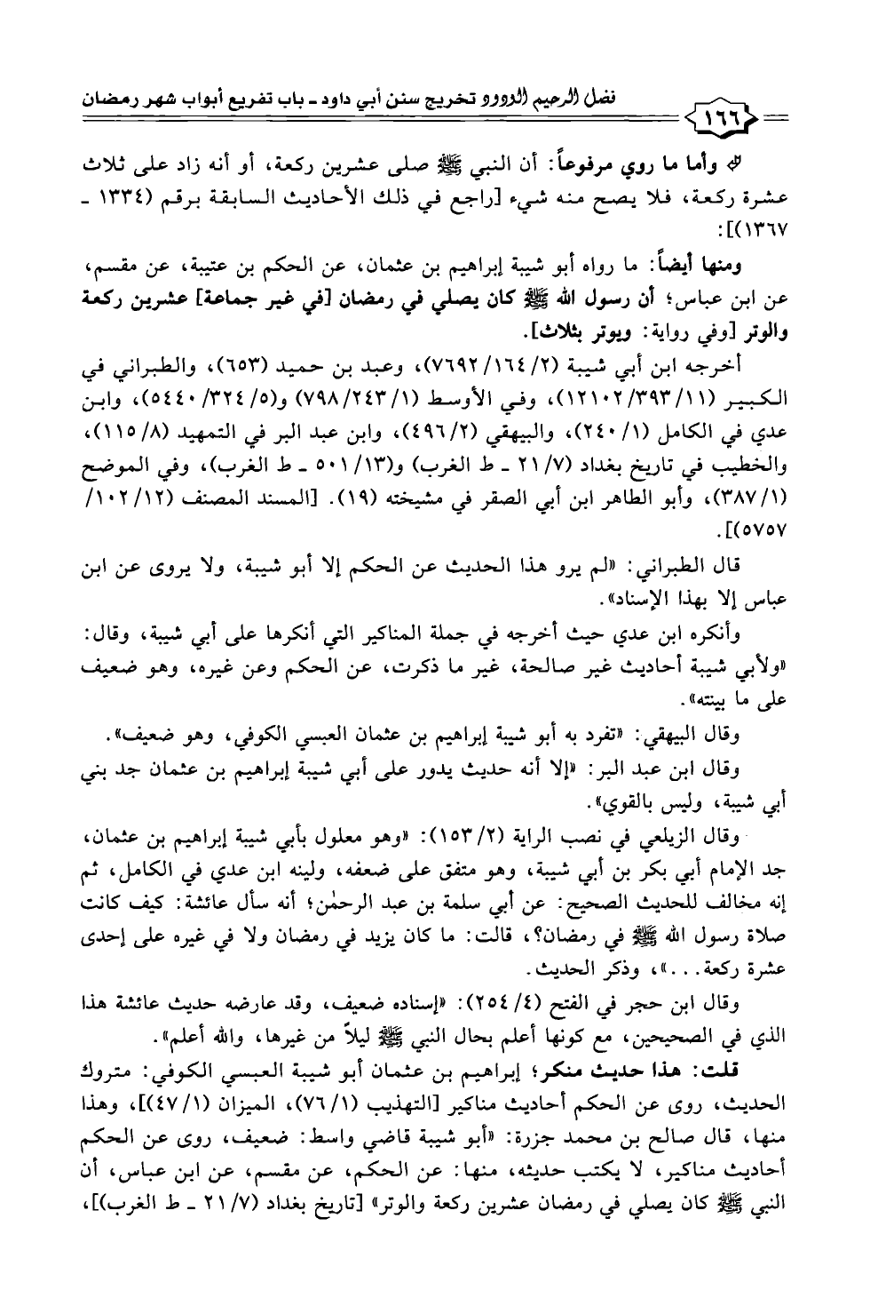 ومنها أيضًا: ما رواه أبو شيبة إبراهيم بن عثمان، عن الحكم بن عتيبة، عن مقسم، عن ابن عباس؛ أن رسول الله -صلى الله عليه وسلم- كان يصلي في رمضان [في غير جماعة، عشرين ركعة والوتر [وفي رواية: ويوتر بثلاث].