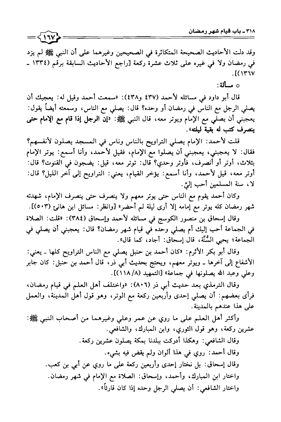وكان أحمد يقوم مع الناس حتى يوتر معهم ولا ينصرف حتى ينصرف الإمام، شهدته شهر رمضان كله يوتر مع إمامه إلا أرى ليلة لم أحضر" [وانظر: مسائل ابن هانئ (٥٠٣)].