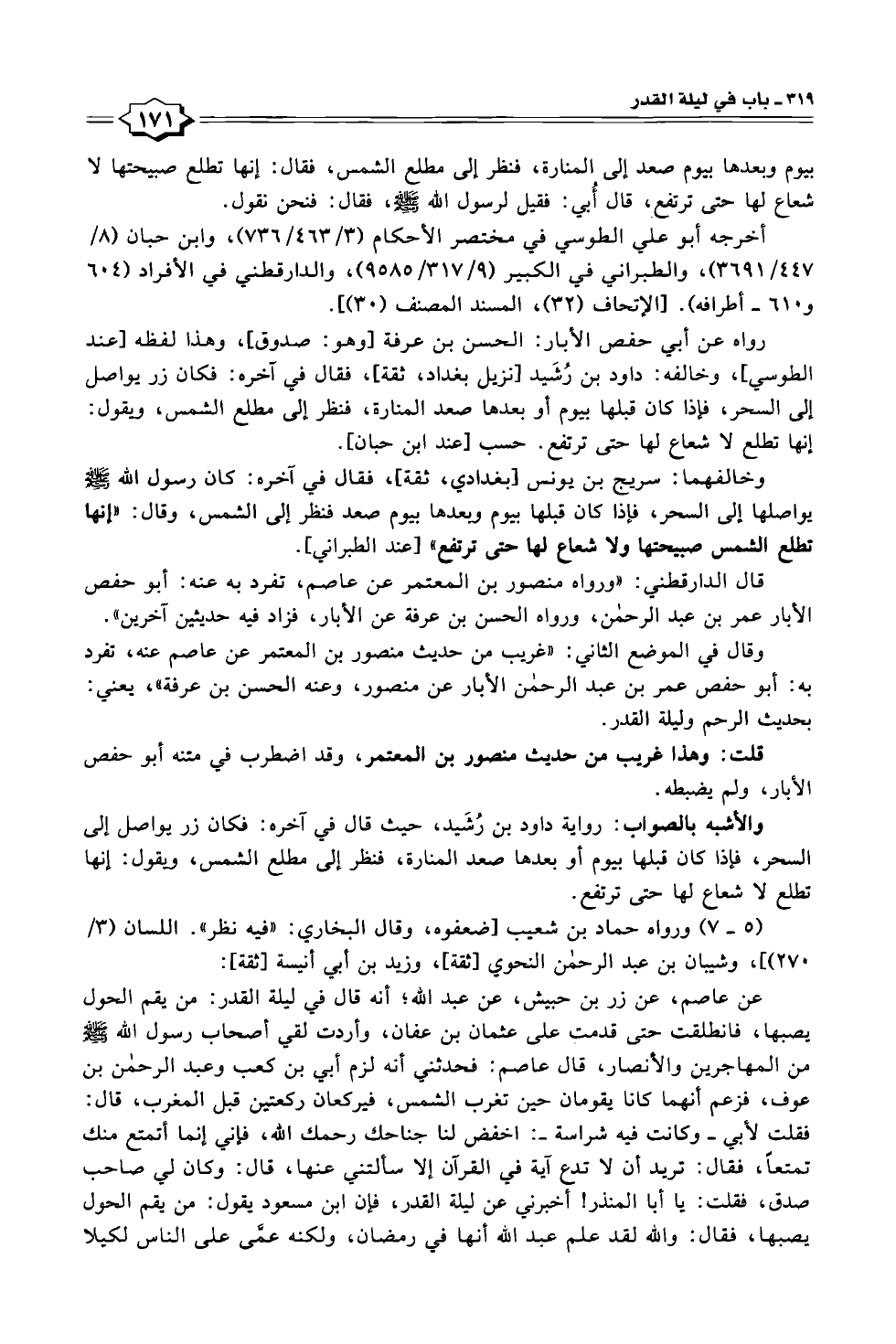 رواه عن أبي حفص الأبار: الحسن بن عرفة [وهو: صدوق]؛ وهذا لفظه [عند الطوسي]؛ وخالفه: داود بن رُشَيد [نزيل بغداد، ثقة]؛ فقال في آخره: فكان زر يواصل إلى السحر، فإذا كان قبلها بيوم أو بعدها صعد المنارة، فنظر إلى مطلع الشمس، ويقول: إنها تطلع لا شعاع لها حتى ترتفع. حسب [عند ابن حبان].