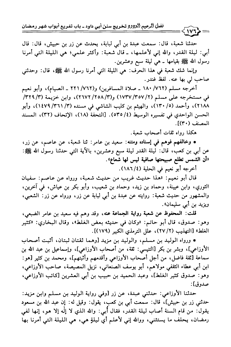 • وخالفهم فوهم في إسناده ومتنه: سعيد بن عامر: ثنا شعبة، عن عاصم، عن زر، عن أبي بن كعب، قال: ليلة القدر ليلة سبع وعشرين، بالآية التي حدثنا رسول الله -صلى الله عليه وسلم-: "أن الشمس تطلع صبيحتها صافية ليس لها شعاع".
