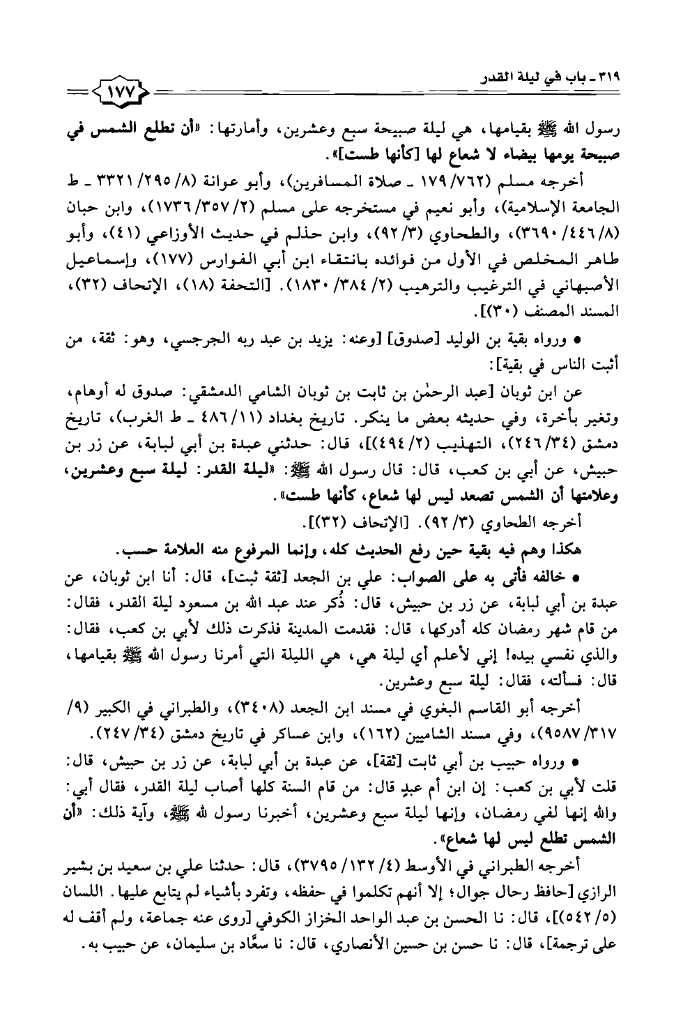 • ورواه حبيب بن أبي ثابت [ثقة]؛ عن عبدة بن أبي لبابة، عن زر بن حبيش، قال: قلت لأبي بن كعب: إن ابن أم عبدٍ قال: من قام السنة كلها أصاب ليلة القدر، فقال أبي: والله إنها لفي رمضان، وإنها ليلة سبع وعشرين، أخبرنا رسول لله -صلى الله عليه وسلم-، وآية ذلك: "أن الشمس تطلع ليس لها شعاع".