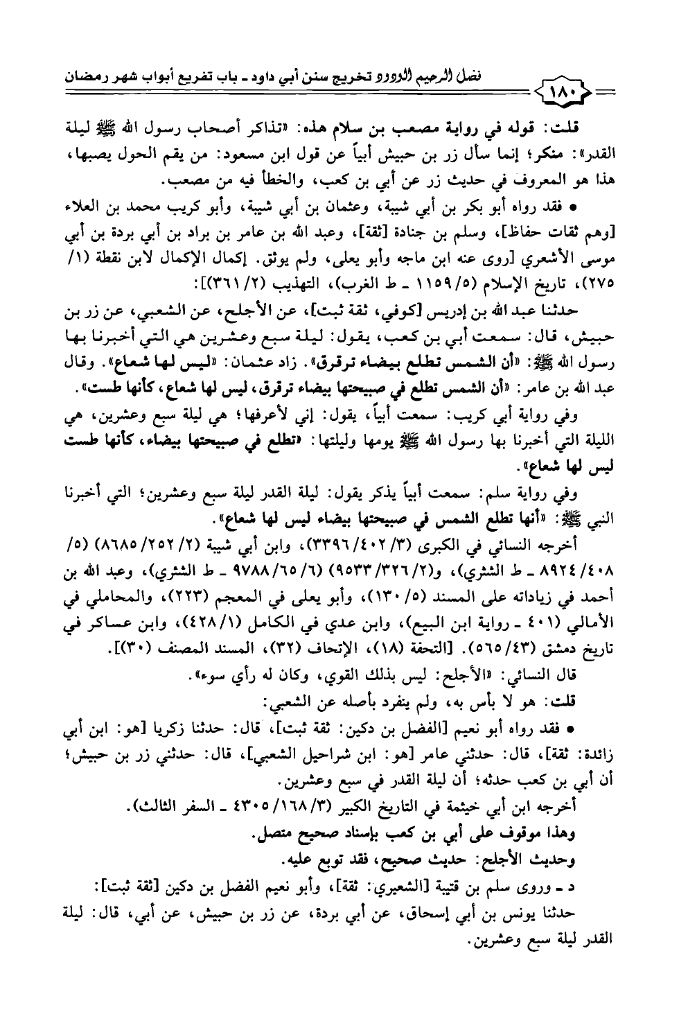 قلت: قوله في رواية مصعب بن سلام هذه: "تذاكر أصحاب رسول الله -صلى الله عليه وسلم- ليلة القدر": منكر؛ إنما سأل زر بن حبيش أبيًا عن قول ابن مسعود: من يقم الحول يصبها، هذا هو المعروف في حديث زر عن أبي بن كعب، والخطأ فيه من مصعب.