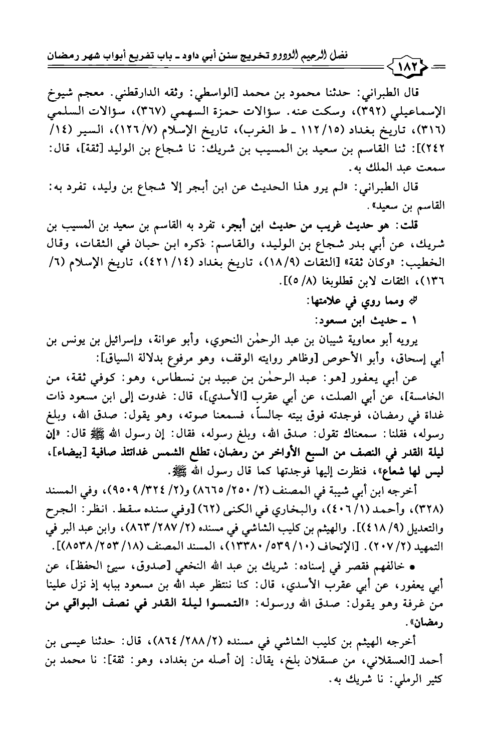 • خالفهم فقصر في إسناده: شريك بن عبد الله النخعي [صدوق، سيئ الحفظ]؛ عن أبي يعفور، عن أبي عقرب الأسدي، قال: كنا ننتظر عبد الله بن مسعود ببابه إذ نزل علينا من غرفة وهو يقول: صدق الله ورسوله: "التمسوا ليلة القدر في نصف البواقي من رمضان".