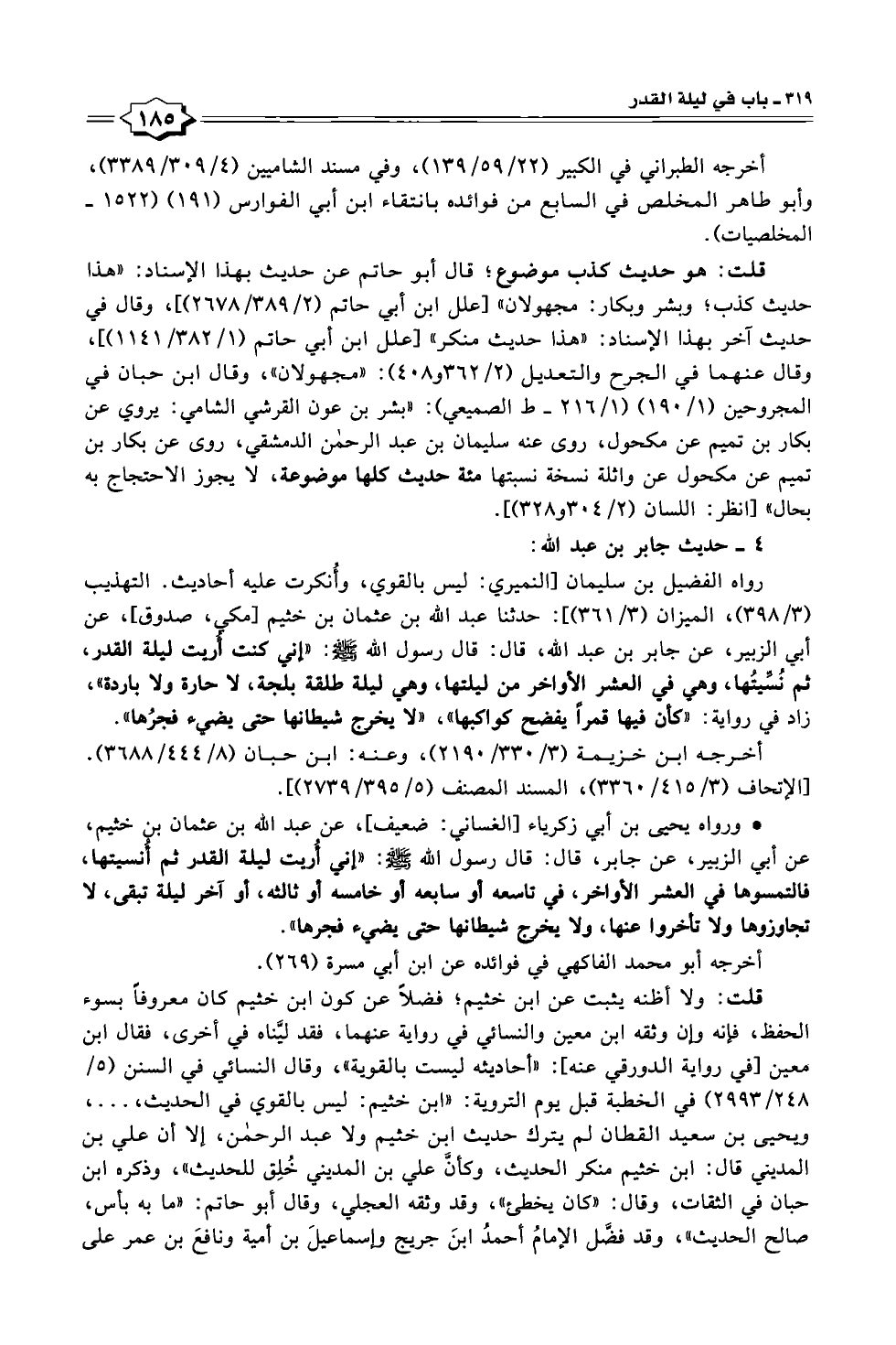 • ورواه يححور بن أبي زكرياء [الغساني: ضعيف]؛ عن عبد الله بن عثمان بن خثيم، عن أبي الزبير، عن جابر، قال: قال رسول الله -صلى الله عليه وسلم-: "إني أُريت ليلة القدر ثم أُنسيتها، فالتمسوها في العشر الأواخر، في تاسعه أو سابعه أو خامسه أو ثالثه، أو آخر ليلة تبقى، لا تجاوزوها ولا تأخروا عنها، ولا يخرج شيطانها حتى يضيء فجرها".