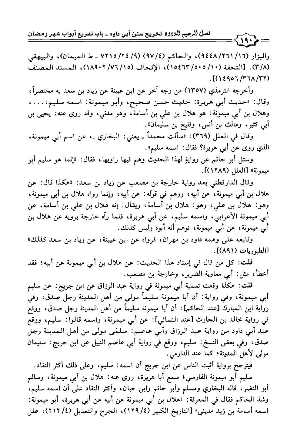 قلت: هكذا وقعت تسمية أبي ميمونة في رواية عبد الرزاق عن ابن جريج: عن سليم أبي ميمونة، وفي رواية: أن أبا ميمونة سليمًا مولى من أهل المدينة رجل صدق، وفي رواية ابن المبارك [عند الحاكم]: أن أبا ميمونة سليمًا من أهل المدينة رجل صدق، ووقع في رواية خالد بن الحارث [عند النسائي]: عن أبي ميمونة، واسمه قالوا: سليم، ووقع عند أبي داود من رواية عبد الرزاق وأبي عاصم: سلمَى مولى من أهل المدينة رجل صدق، وفي بعض النسخ: سليم، ووقع في رواية أبي عاصم النبيل عن ابن جريج: سليمان مولى لأهل المدينة؛ كما عند الدارمي.